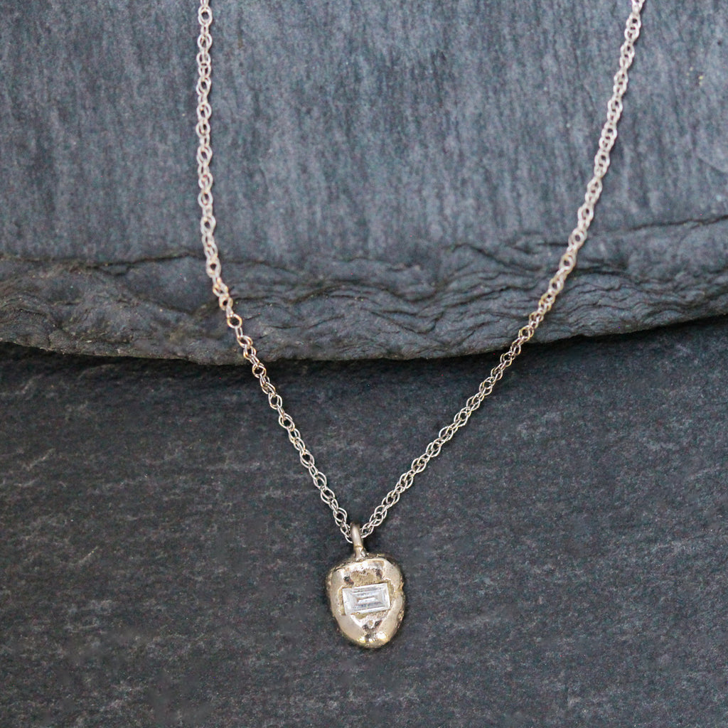 This gorgeous 14k white gold and diamond charm necklace features an organic shaped white gold bubble centerpiece adorned with a flush-set, baguette cut diamond. It's set on a vintage 14k white gold Singapore link chain.