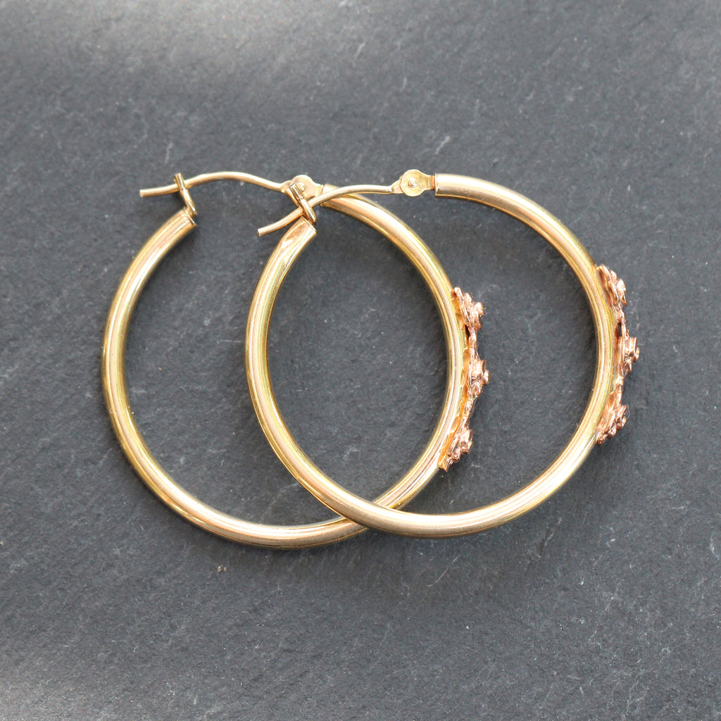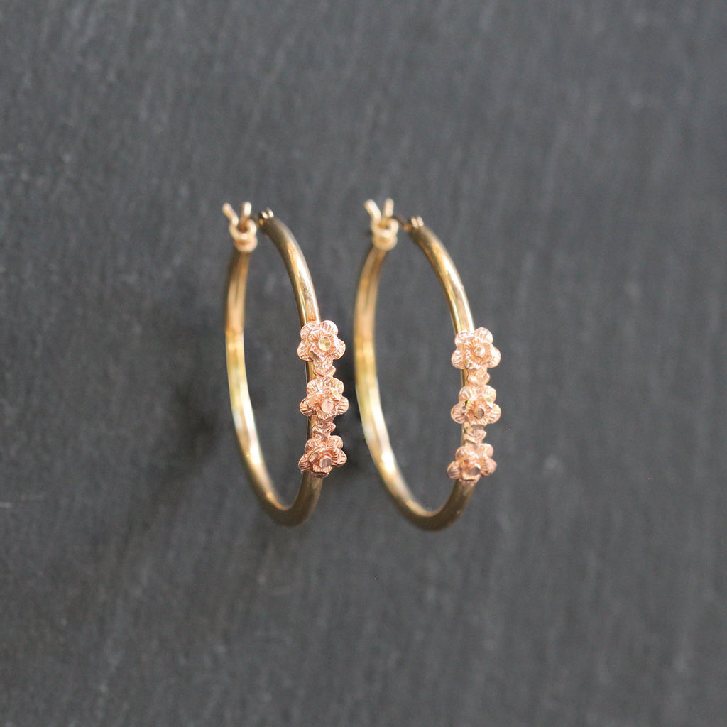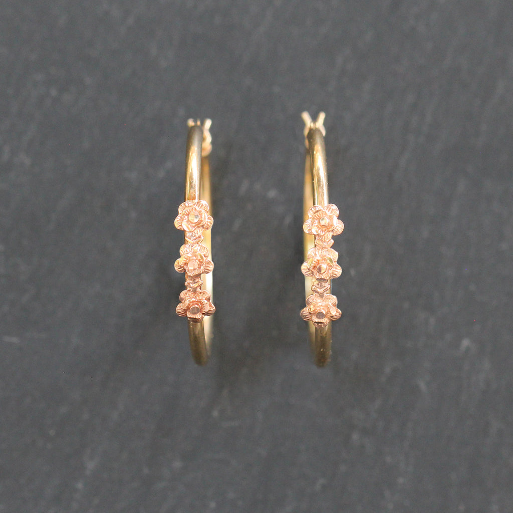 These 14k Yellow Gold Hoop Earrings put a twist on a classic pair of hoops. Featuring 3 rose gold diamond cut flower details on each.
