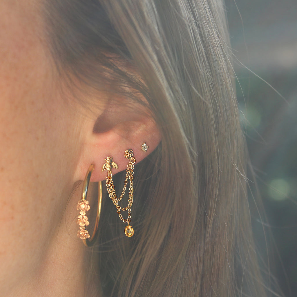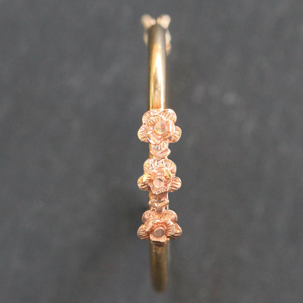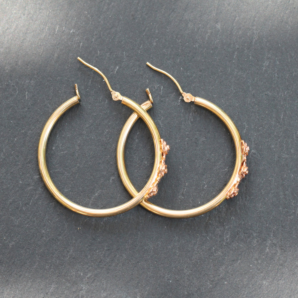 These 14k Yellow Gold Hoop Earrings put a twist on a classic pair of hoops. Featuring 3 rose gold diamond cut flower details on each.