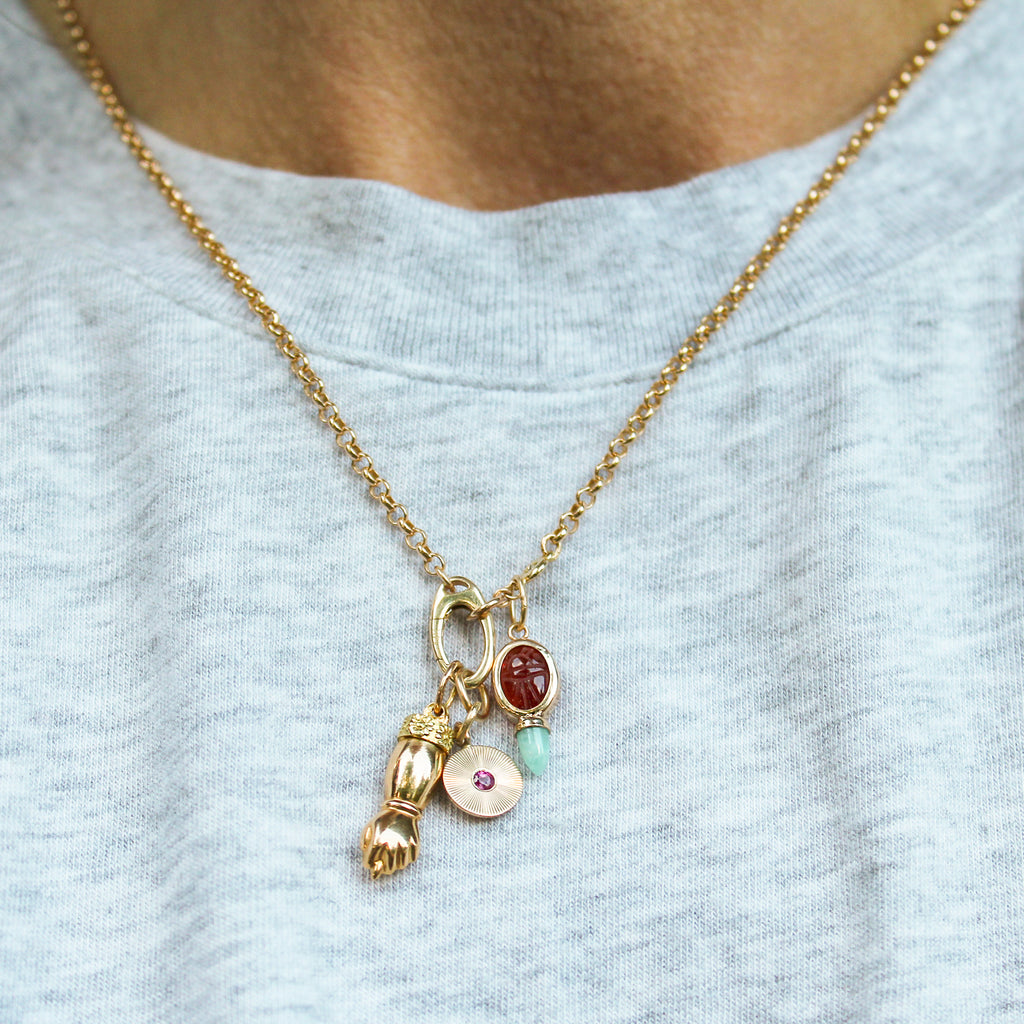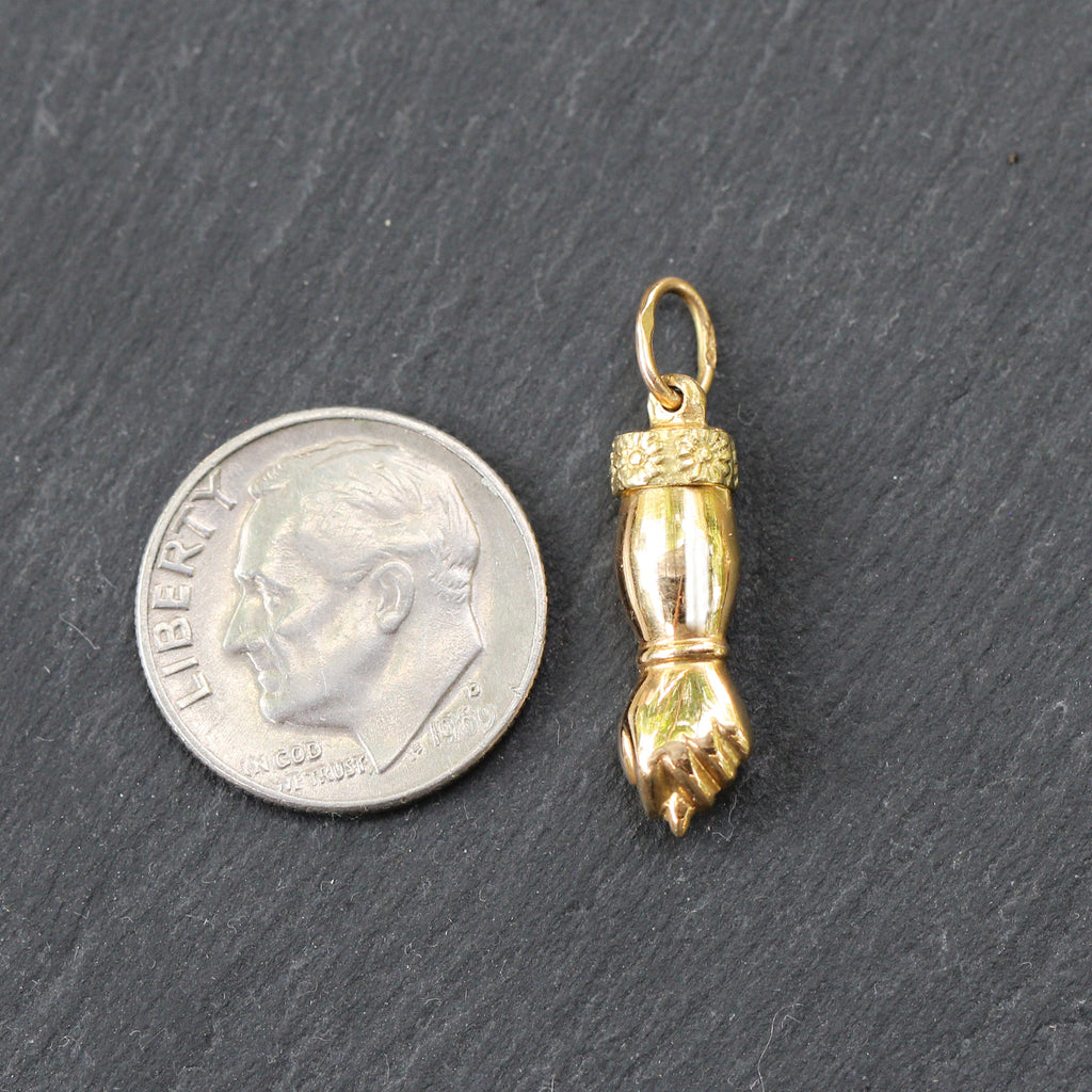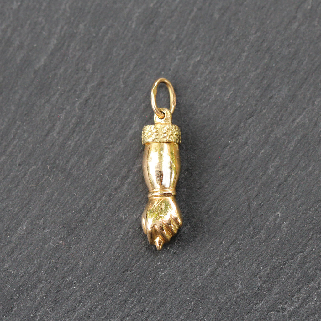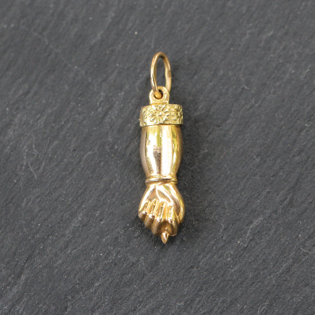 This antique 18k yellow gold Figa talisman features a classic design with a daisy detailed cuff.