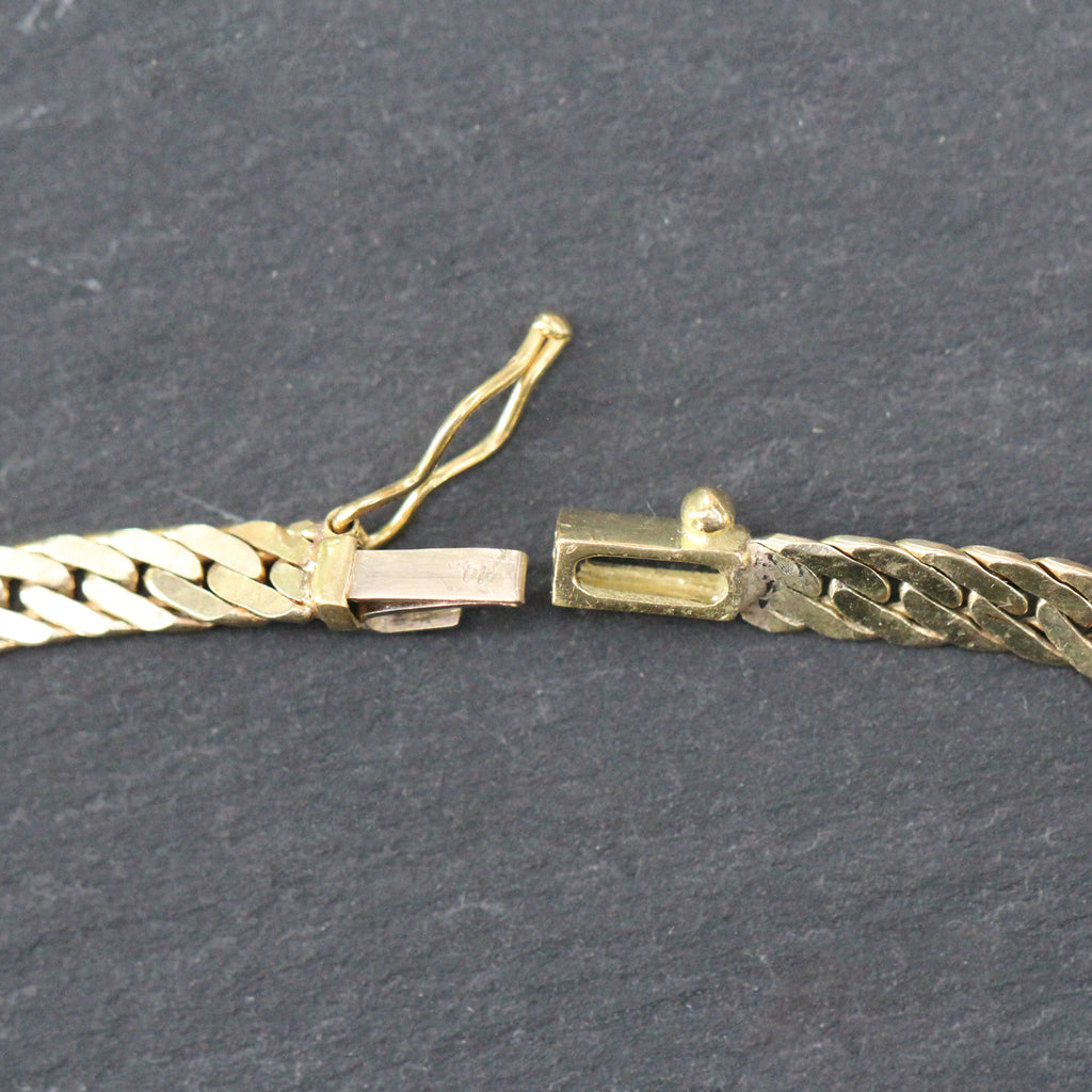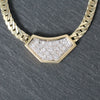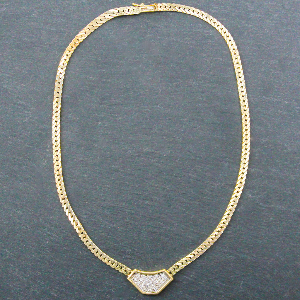 This stunning 14k yellow gold and diamond vintage necklace makes a big statement! Featuring a wide tight curb link chain with a geometric plate in the center and round cut diamond details within the plate. It packs a hefty punch and is truly a one of a kind find for any jewelry lover!