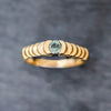 This stunning 14k yellow gold and teal sapphire signet ring features a round cut half bezel set sapphire with hues of light green and blue. The ring has step details on the shoulders creating a signet ring style with a stunning sparkly solitaire sapphire in the center!