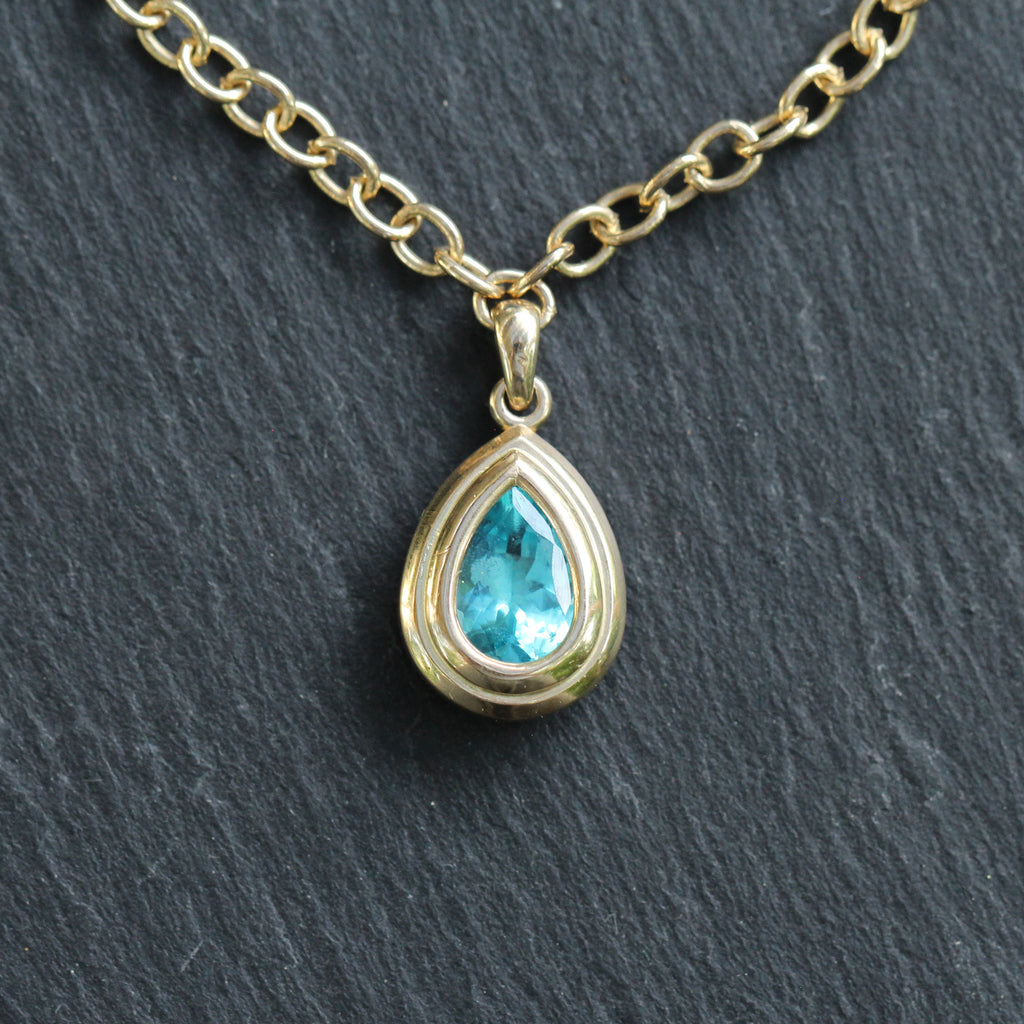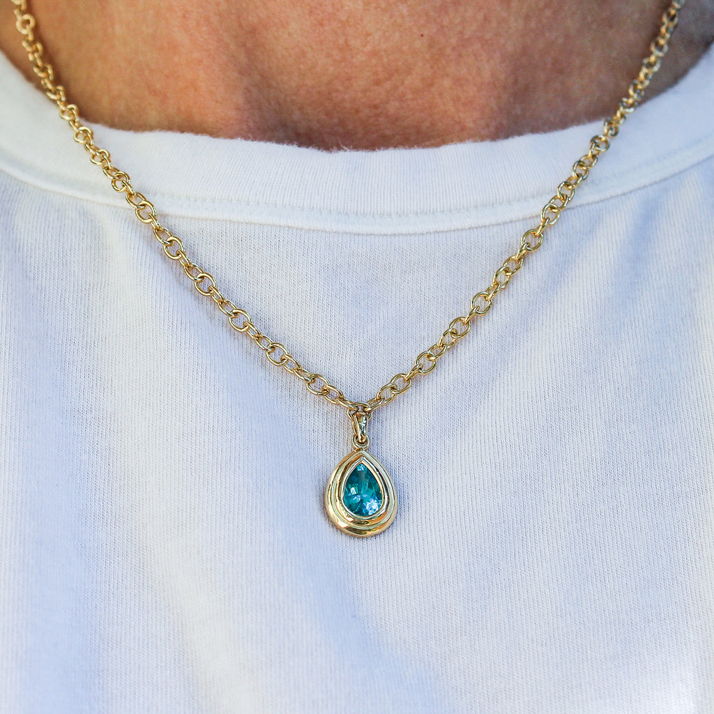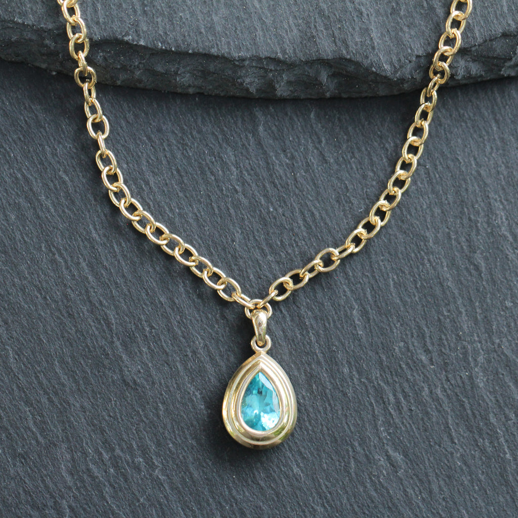 This vibrant 14k yellow gold and apatite necklace features a thick smooth cable link style chain with a pear cut apatite in a step detailed bezel setting stationed as a charm in the center.
