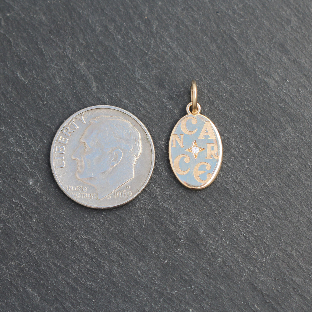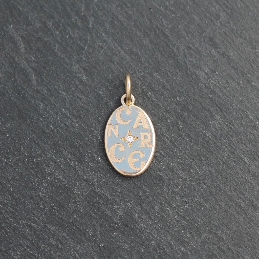 This beautiful 14k yellow gold astrology pendant features the letters for Cancer scattered throughout the edges with a starburst style diamond set in the center. It's a great add to any neckmess and makes a great gift as well!
