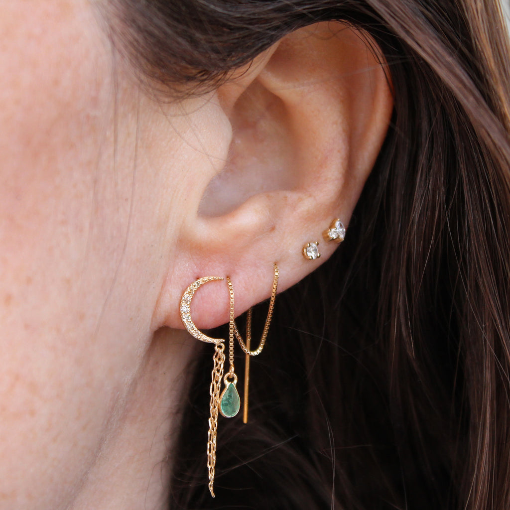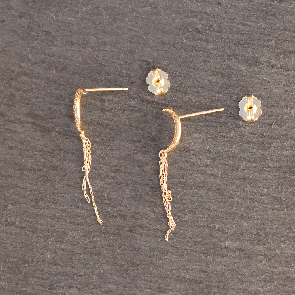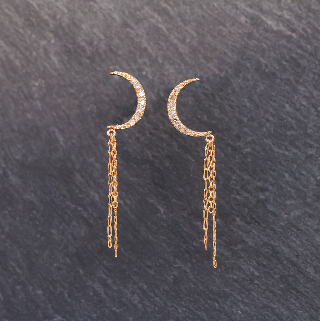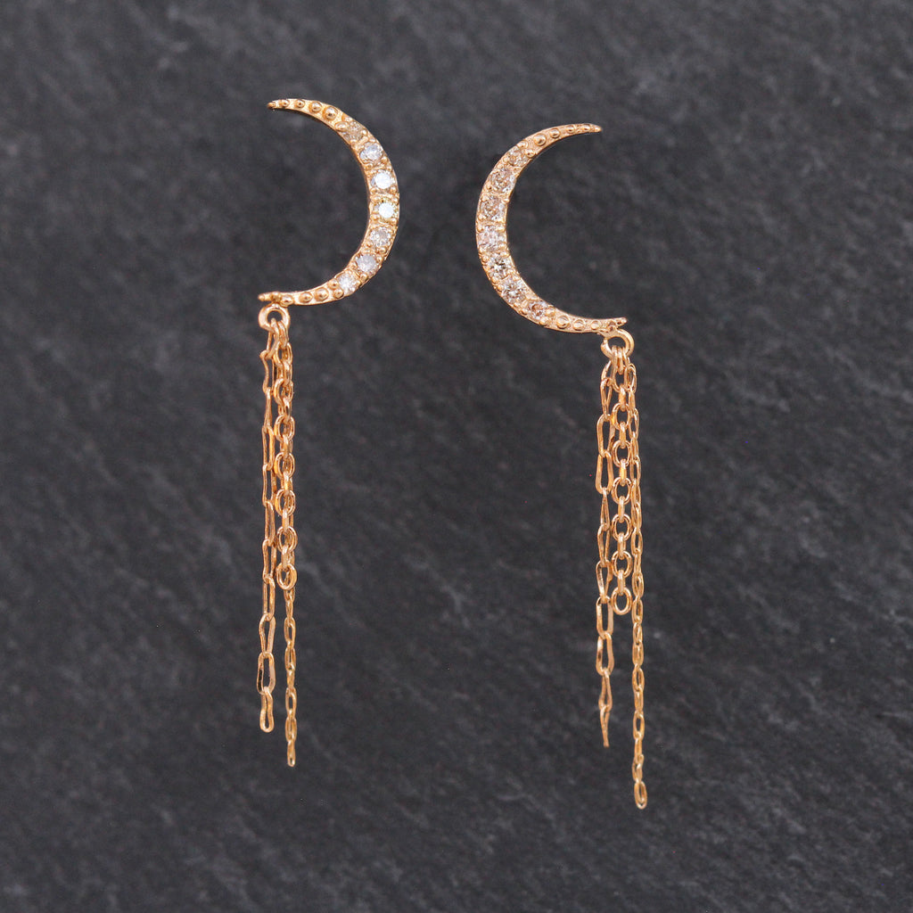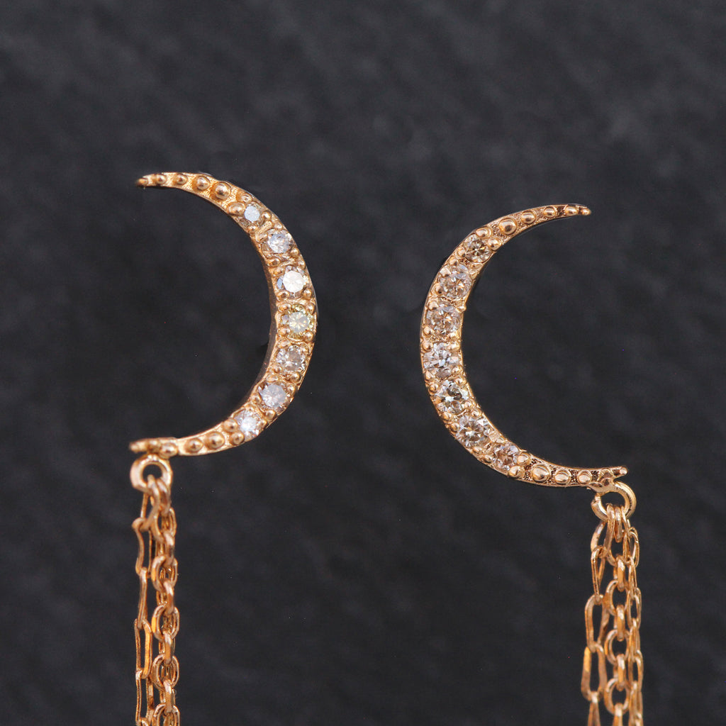 These sparkling 14k yellow gold and diamond earrings feature crescent moons with round cut shared prong set diamonds at the top. 3 different chain styles drop below.