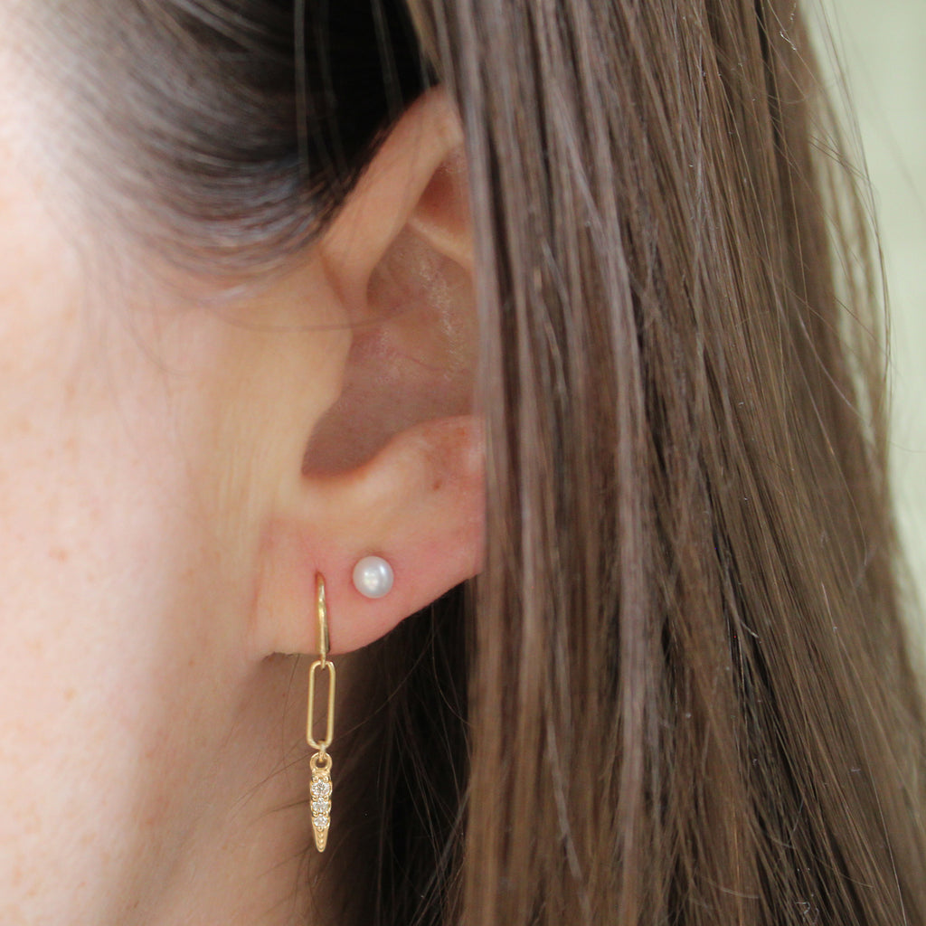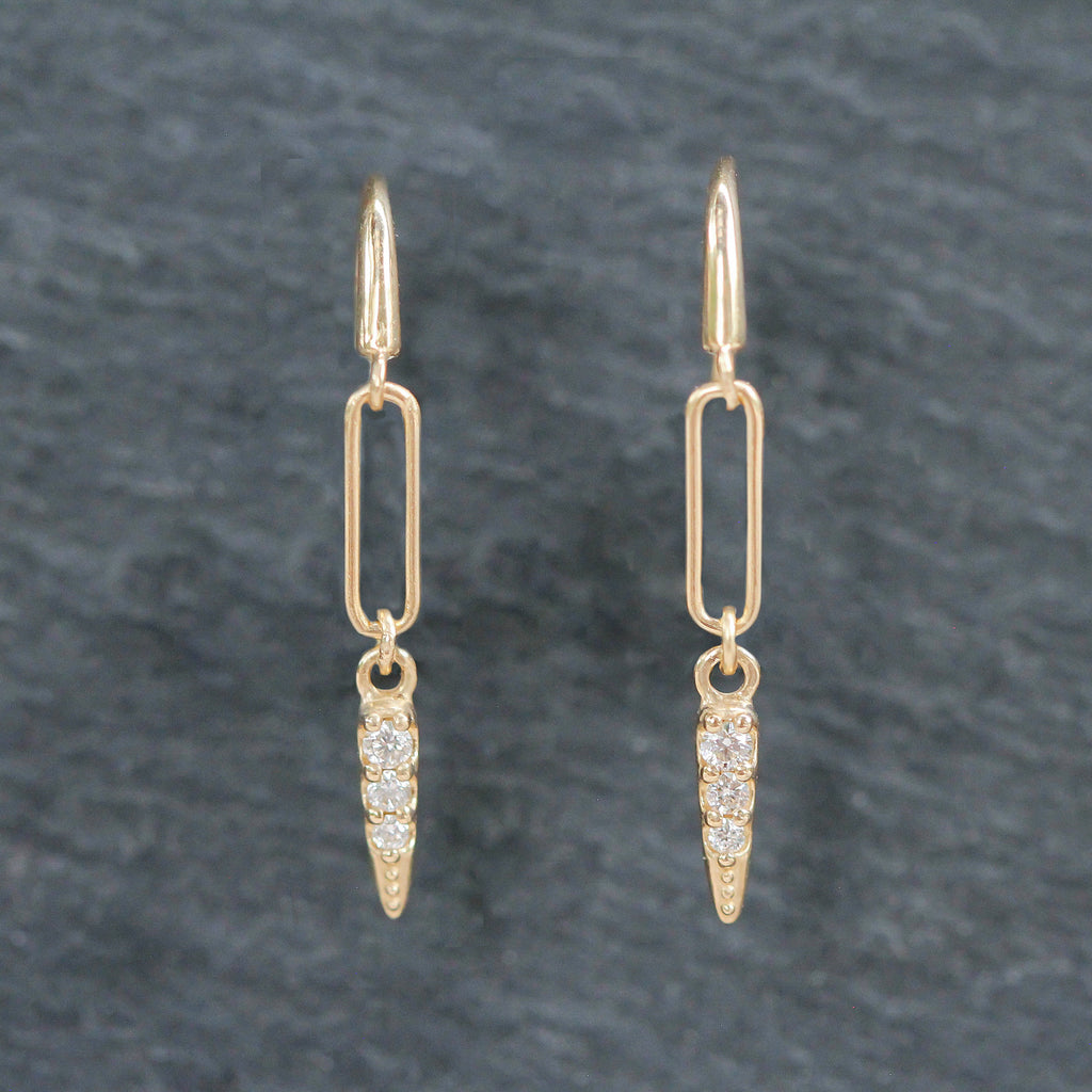 These understated diamond drop earrings are the perfect pair of earrings to wear on a daily basis or for a special occasion. The upcycled earrings were crafted using recycled 14k gold fish hook backs, recycled 14k gold elongated links and finished with round cut prong set diamond spikes at the ends creating one-of-a-kind, ethical diamond earrings.