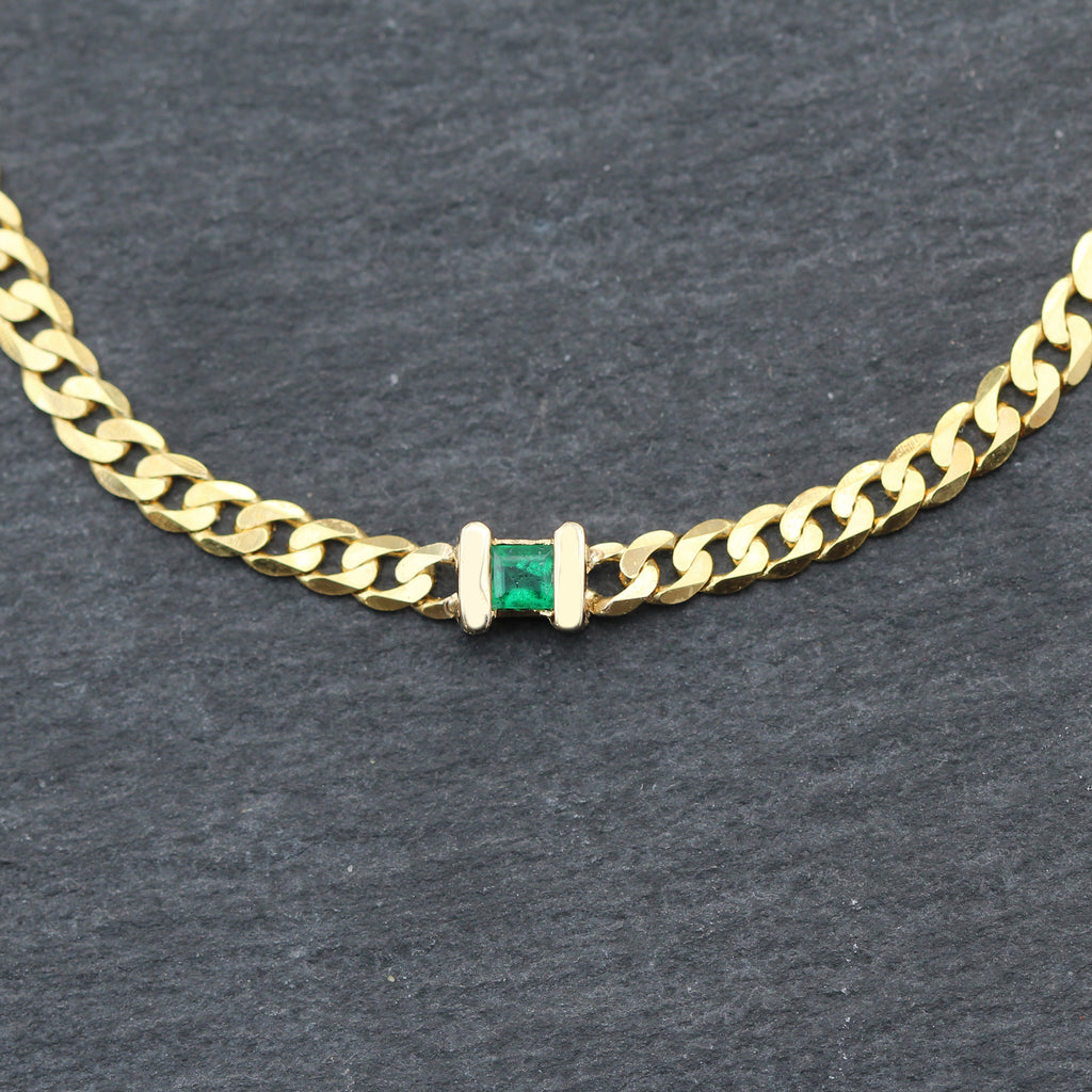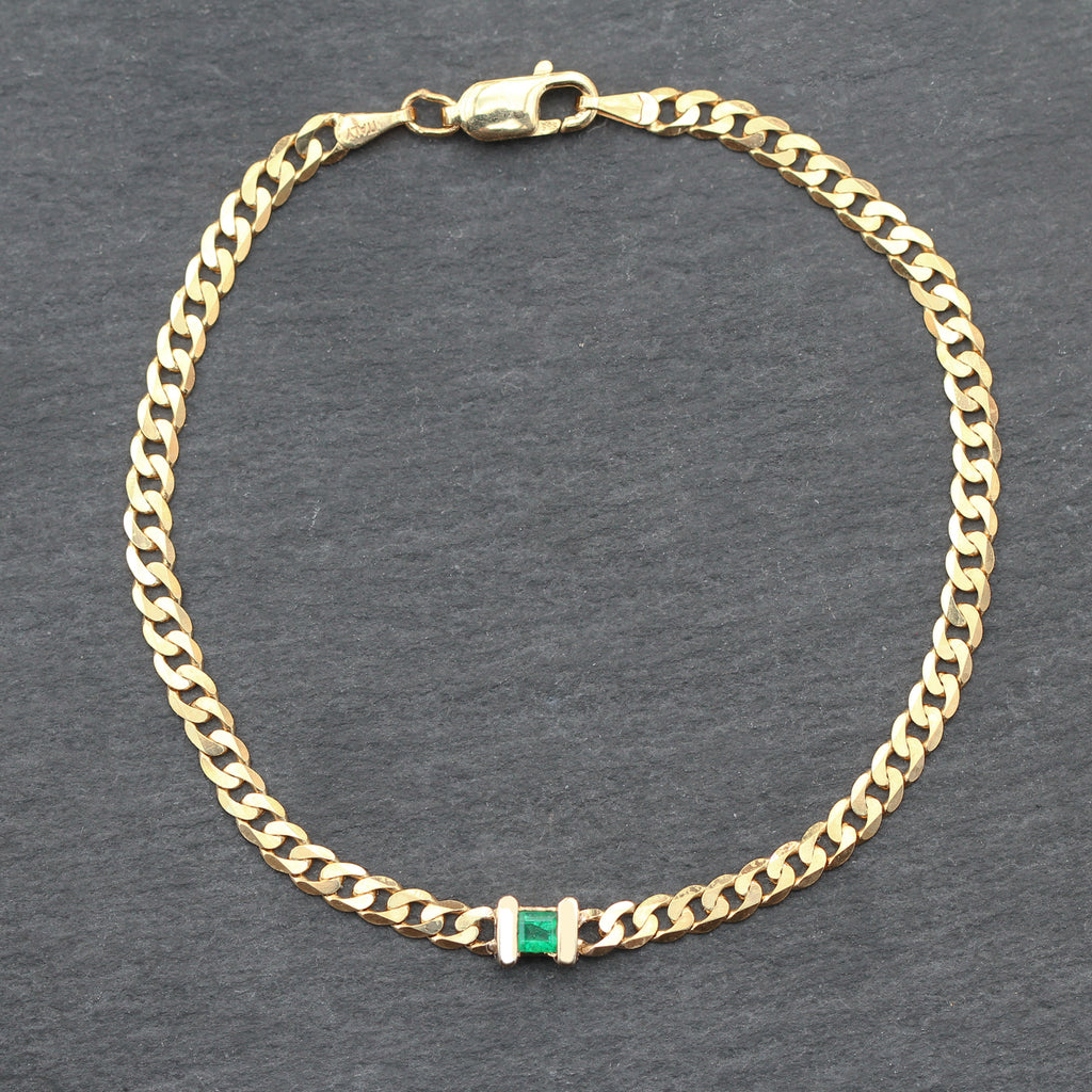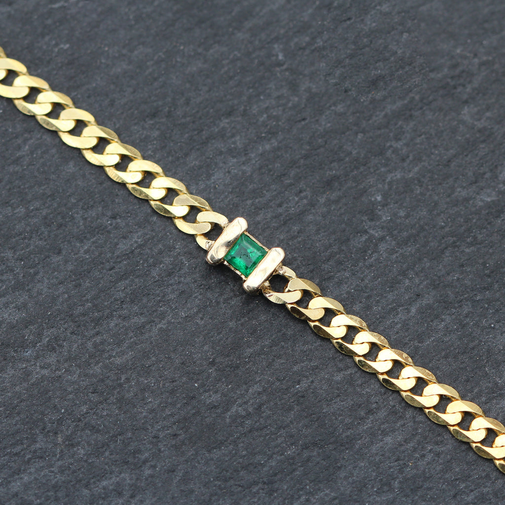 This 14k yellow gold emerald station bracelet features a diamond cut cable link chain with a tension set princess cut emerald in the center.