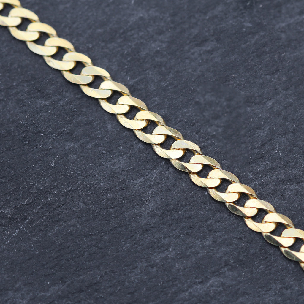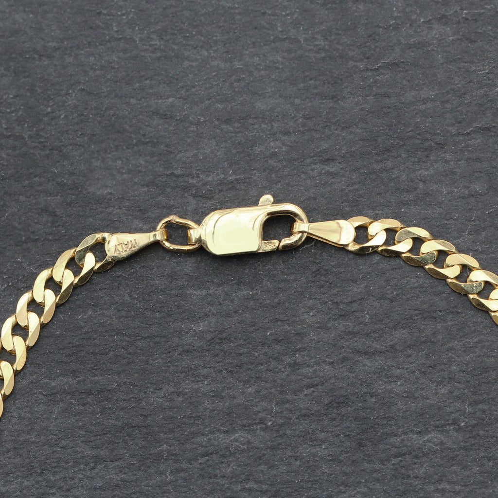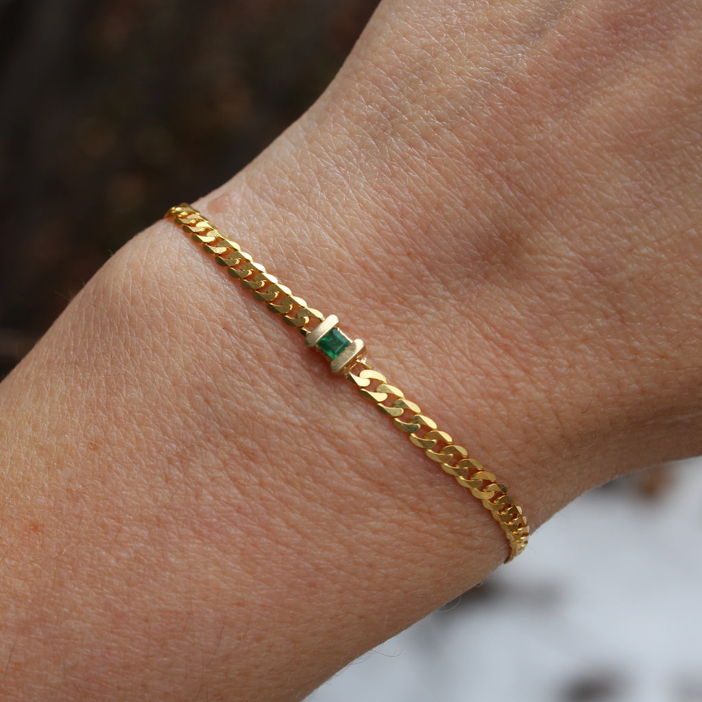 This 14k yellow gold emerald station bracelet features a diamond cut cable link chain with a tension set princess cut emerald in the center.