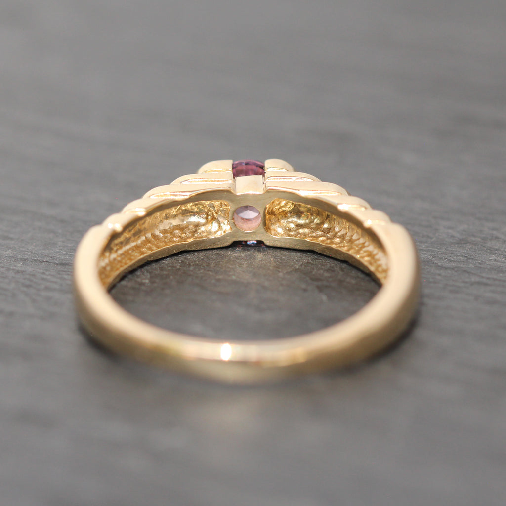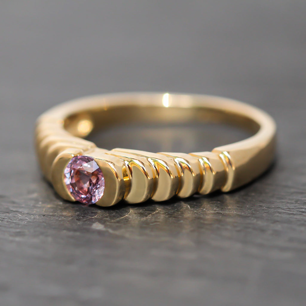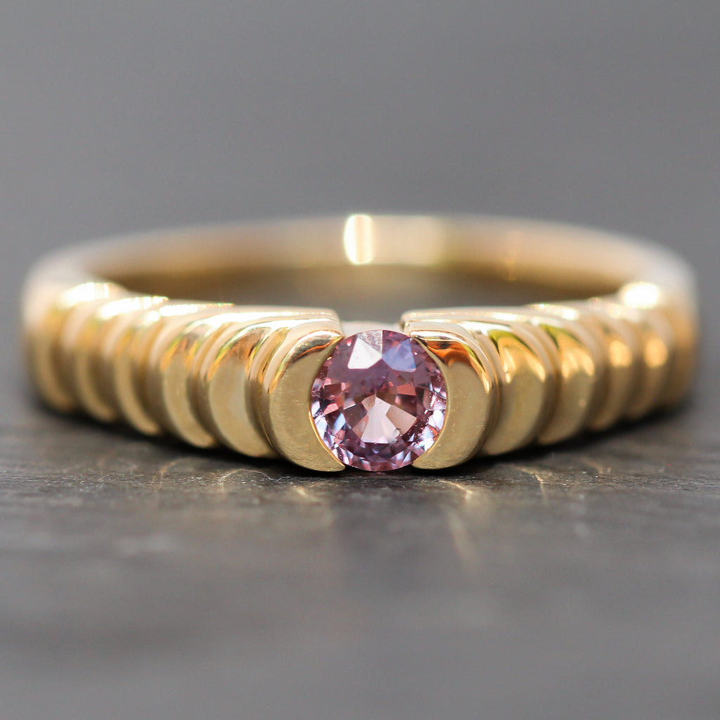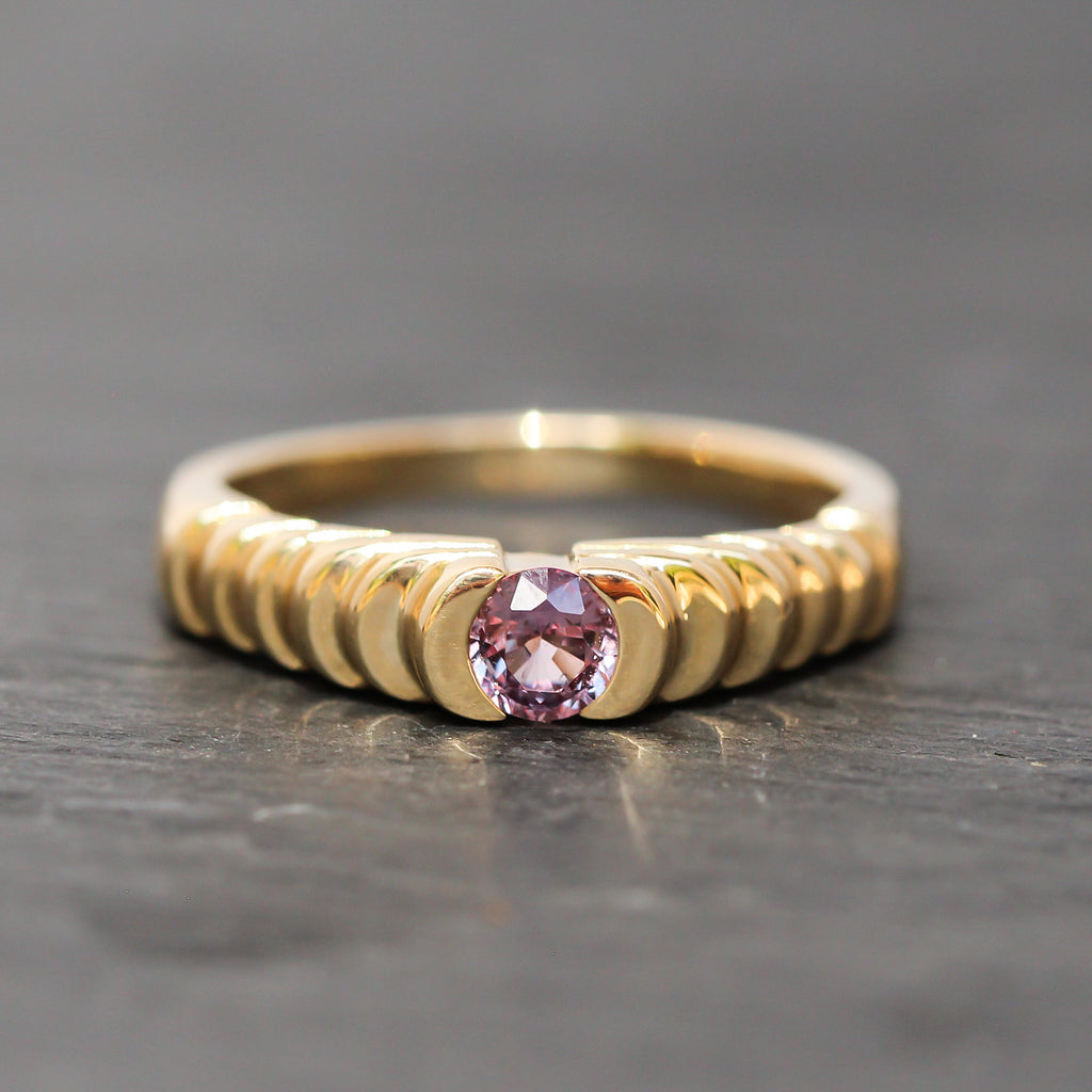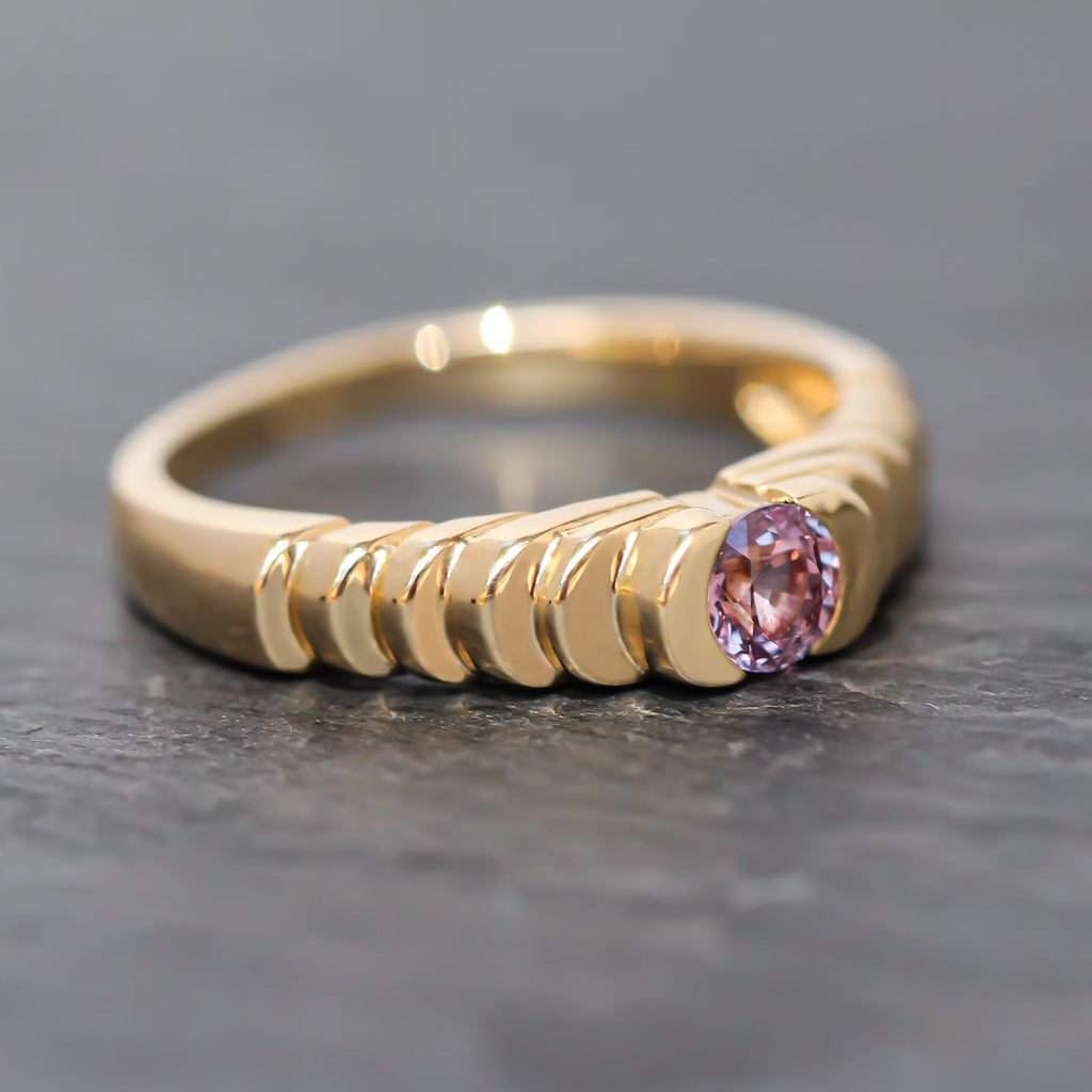 This stunning 14k yellow gold and mauve sapphire signet ring features a round cut half bezel set sapphire with hues of light purple, pink and mauve. The ring has step details on the shoulders creating a signet ring style with a stunning sparkly solitaire sapphire in the center!