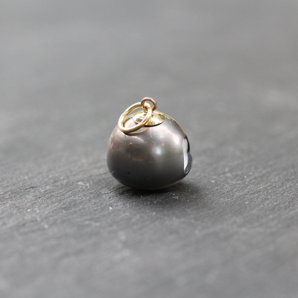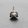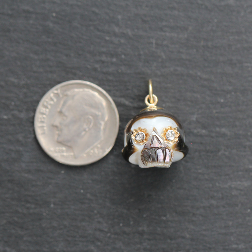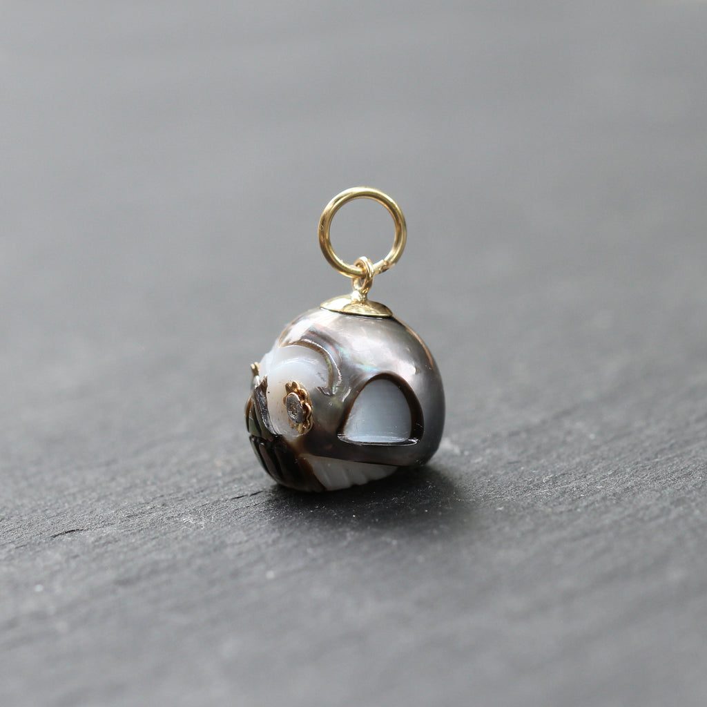 This adorable 14k yellow gold and diamond skull charm features an intricately carved grey and white pearl into the shape of a skull. It has been upcycled by adding scalloped floral detailed round cut bezel set diamonds to the eyes as well as a 14k yellow gold bail.