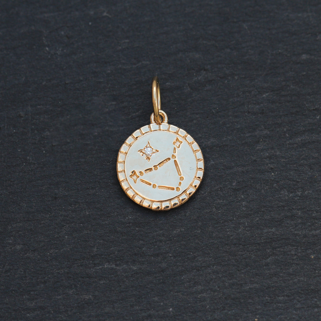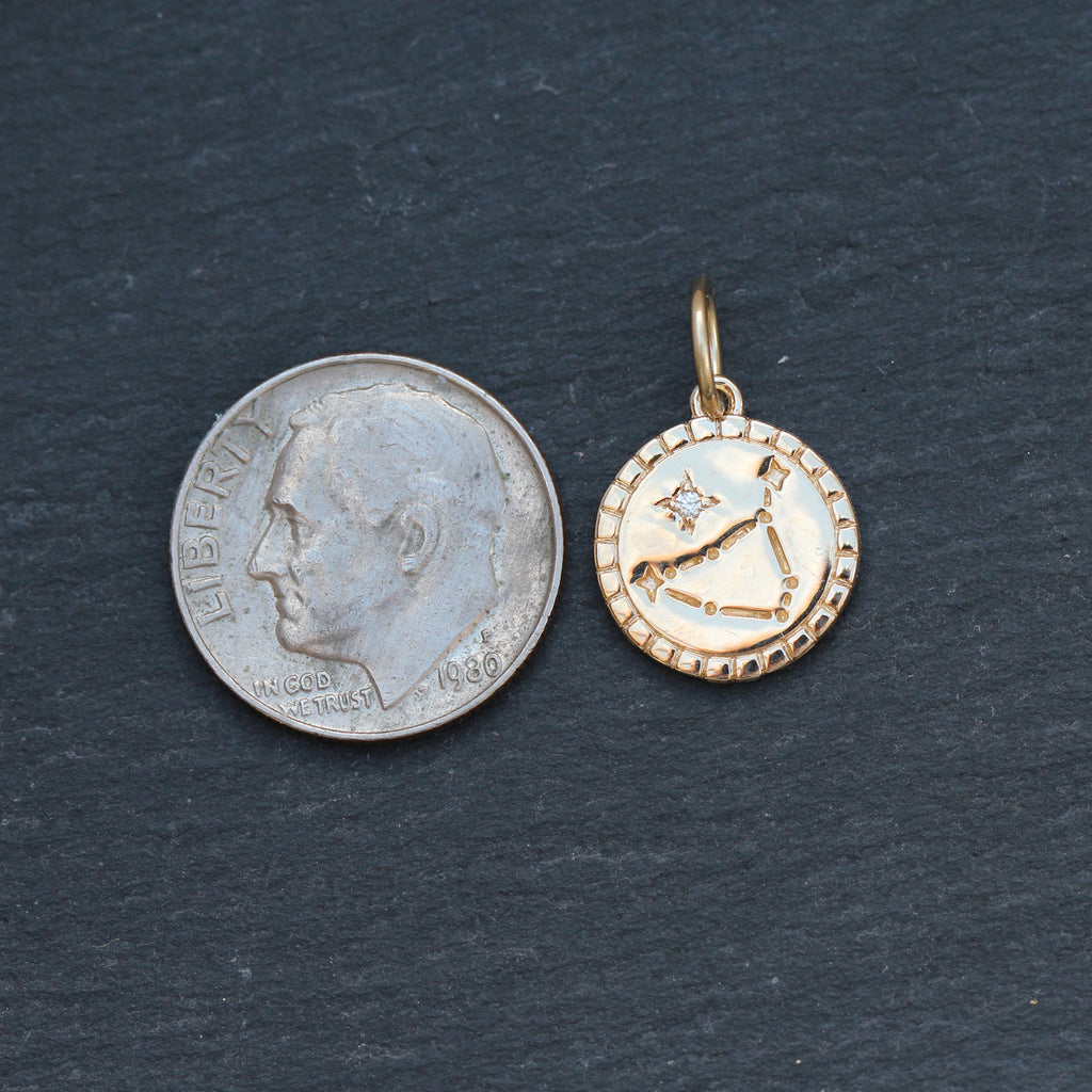 This beautiful 14k yellow gold and diamond constellation pendant features the constellation for the Capricorn zodiac sign with a round cut starburst style diamond. Detailed with a ribbed style framing, this piece is truly a great layering piece or gift for any Capricorn!