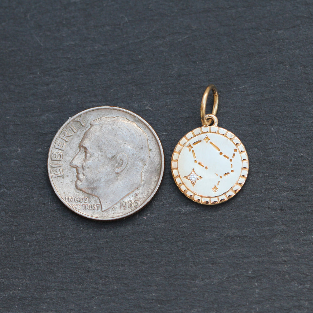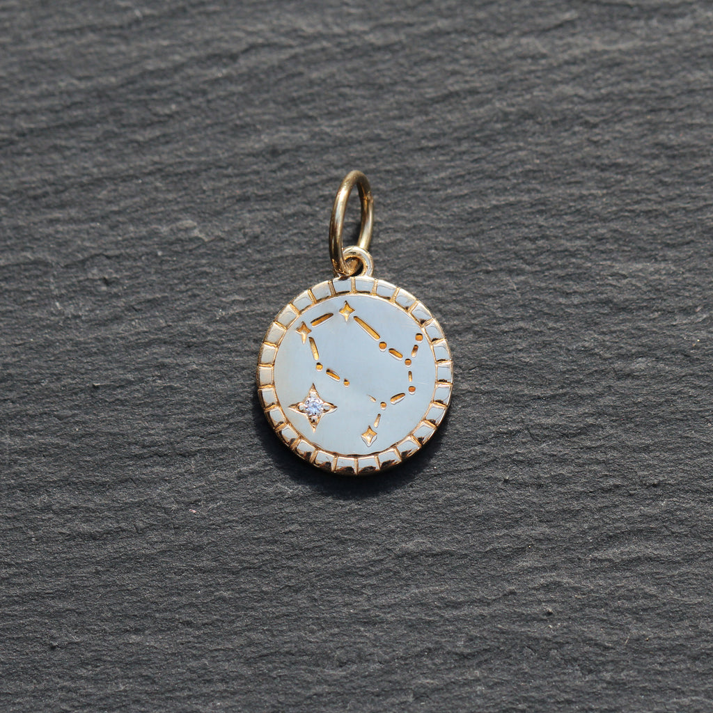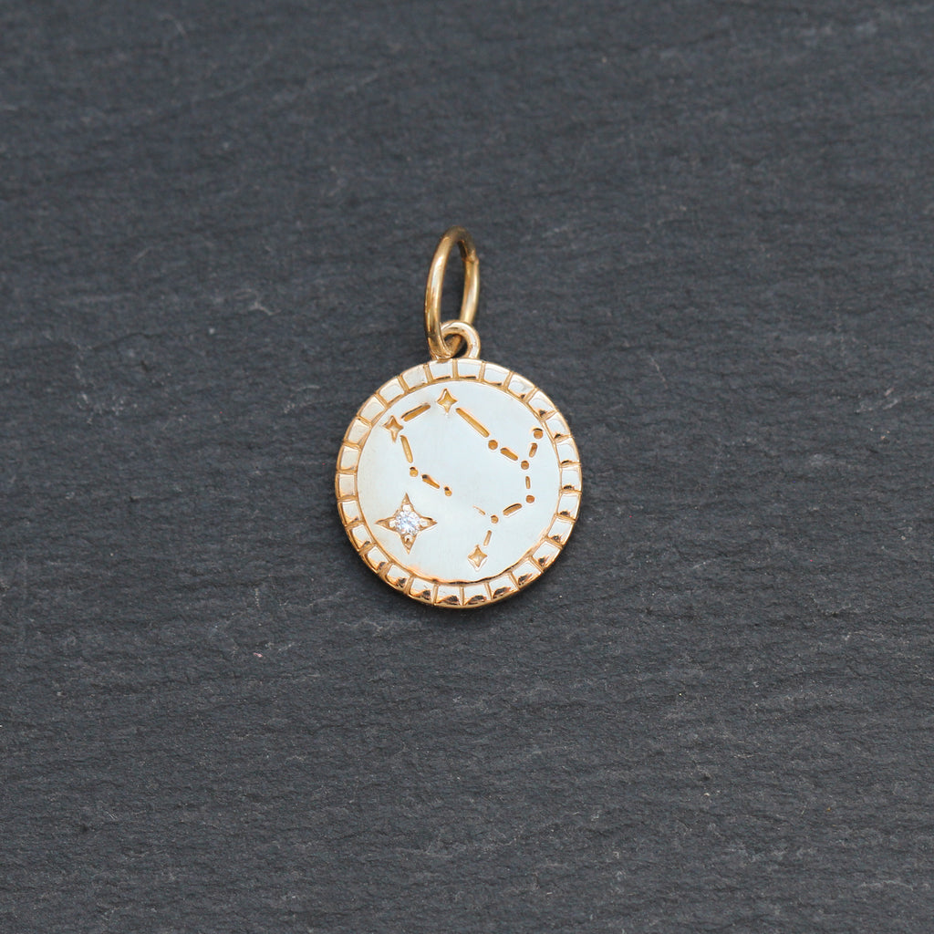 This beautiful 14k yellow gold and diamond constellation pendant features the constellation for the Gemini zodiac sign with a round cut starburst style diamond. Detailed with a ribbed style framing, this piece is truly a great layering piece or gift for any Gemini!