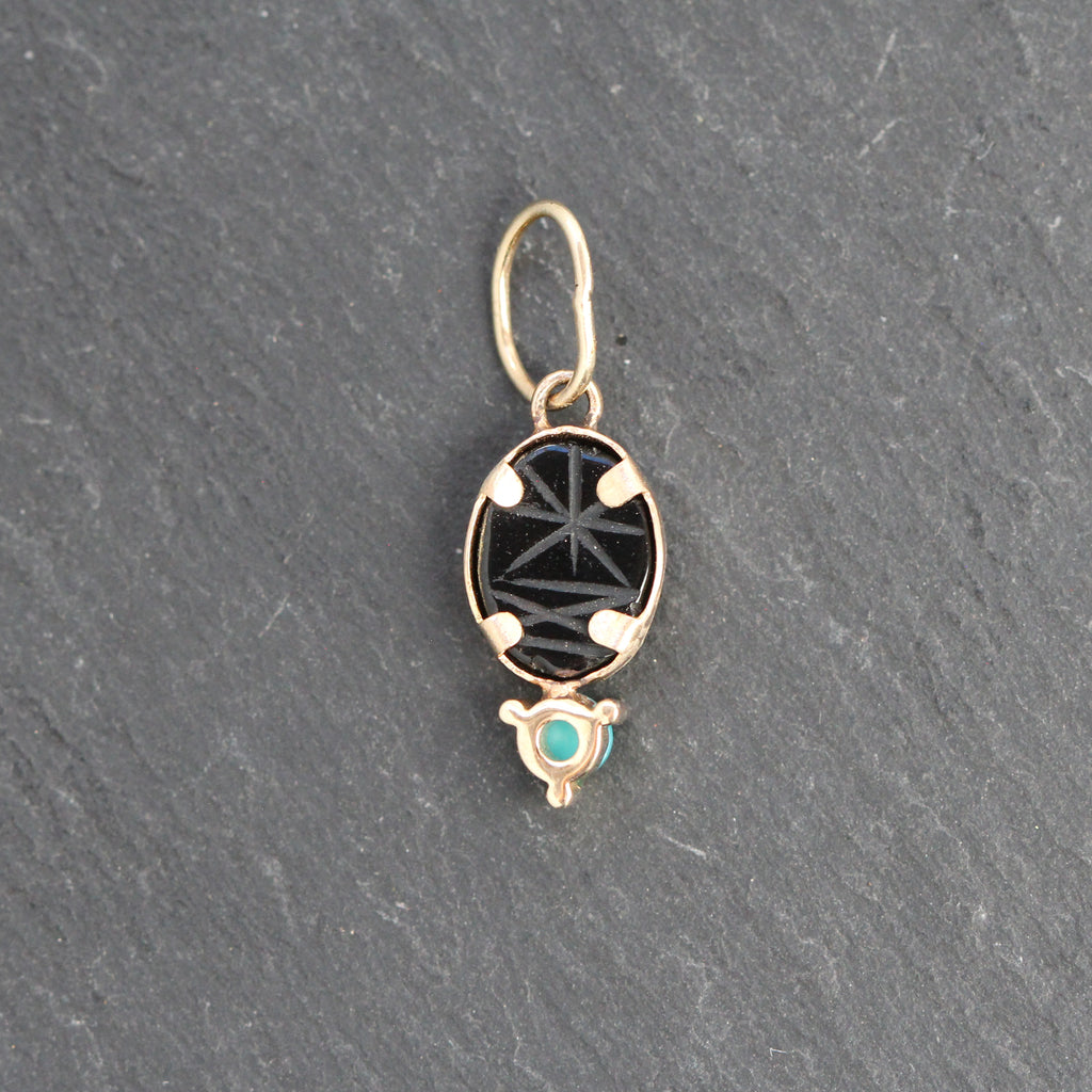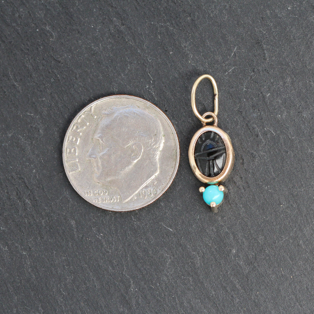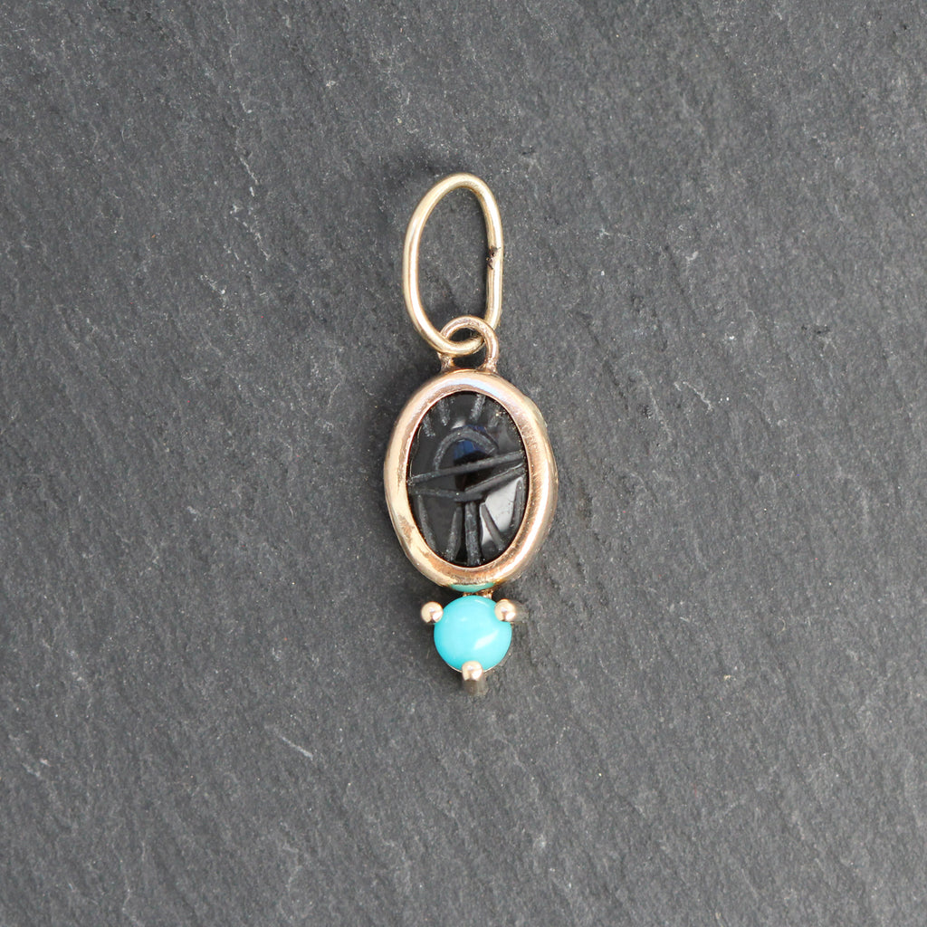 This adorable 14k yellow gold and onyx scarab charm features a cabochon onyx carved into the shape of a scarab in a yellow gold bezel setting, detailed with a round cut prong set turquoise at the base, it's truly a one of a kind gem!