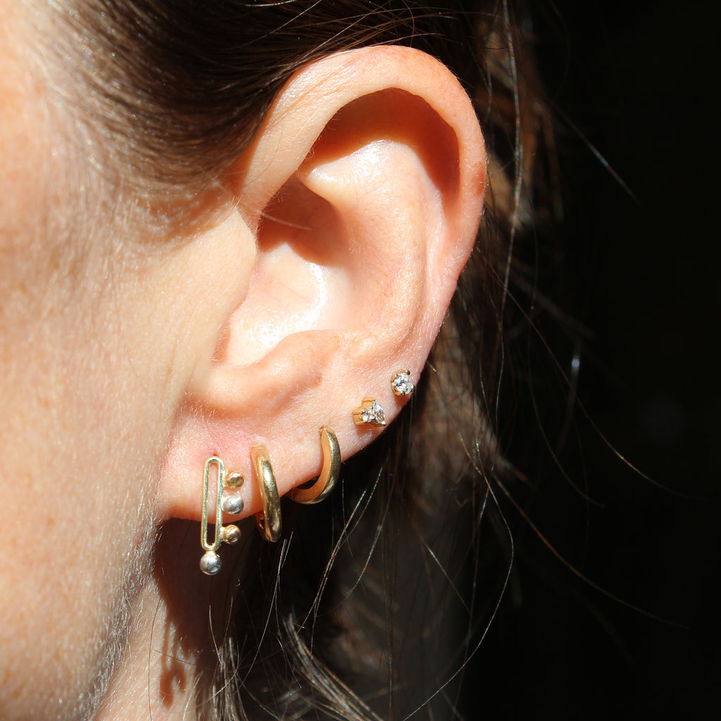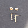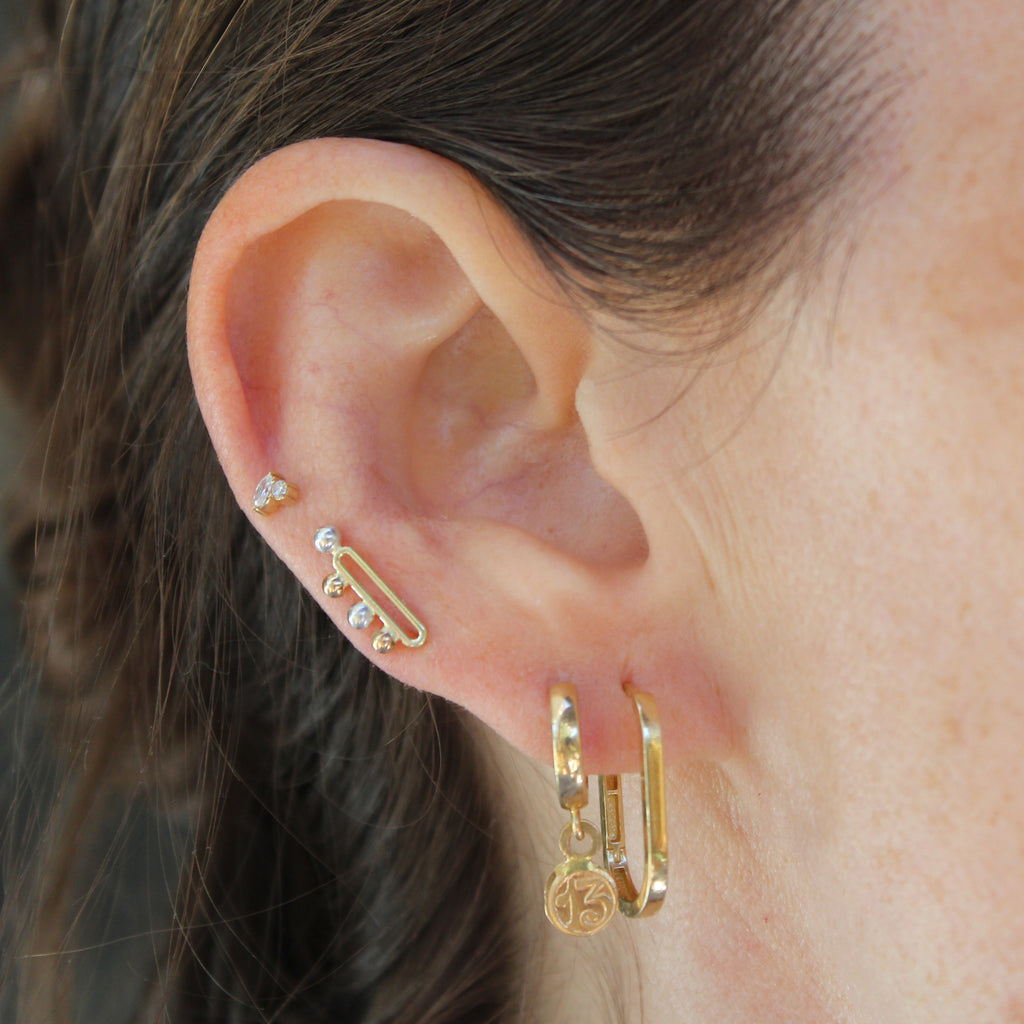 These unique 14k yellow gold and sterling silver earrings feature a 14k gold elongated link as the stud, accented with recycled 14k gold and sterling silver balls that have been melted down from scrap metal. They can be worn vertically or as ear climbers creating versatility!