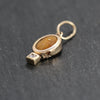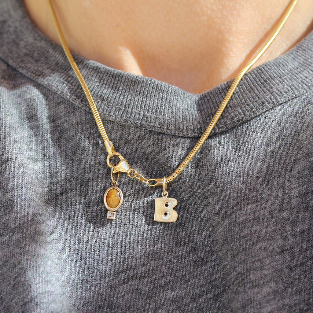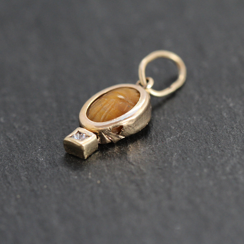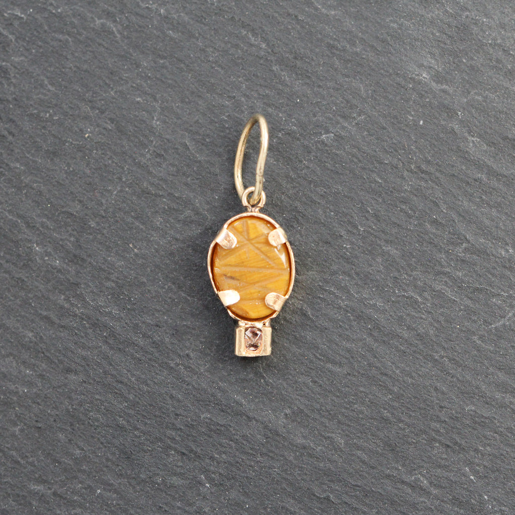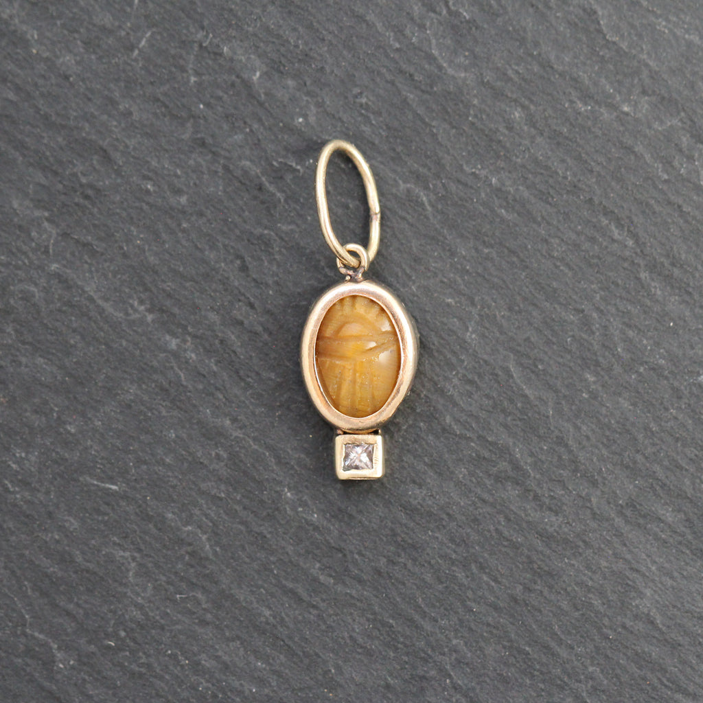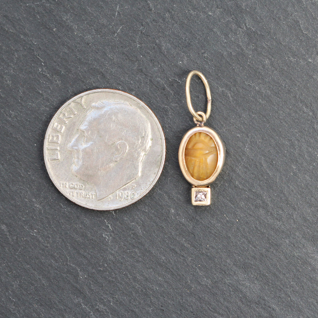 This 14k yellow gold + tigers eye scarab talisman features polished Tigers Eye gemstone carved into a Scarab Beetle. The pendent is set with a 14k gold, and accented with a bezel set princess cut diamond at the base.