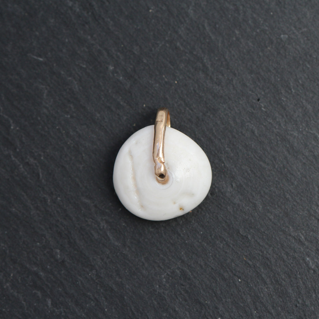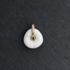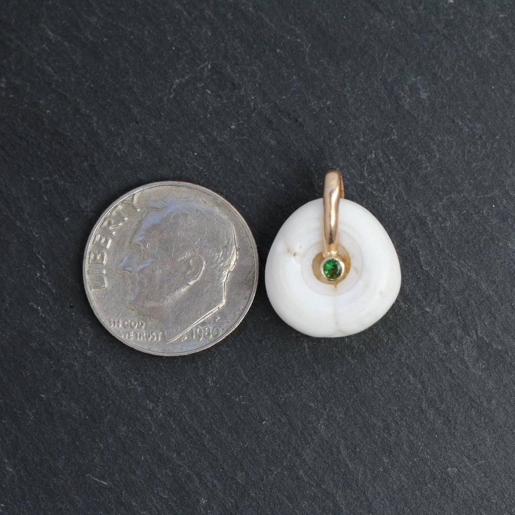 This adorable shell charm features a donut style shaped and open center. Detailed with a round cut bezel set tsavorite and a 14k yellow gold bail.