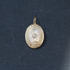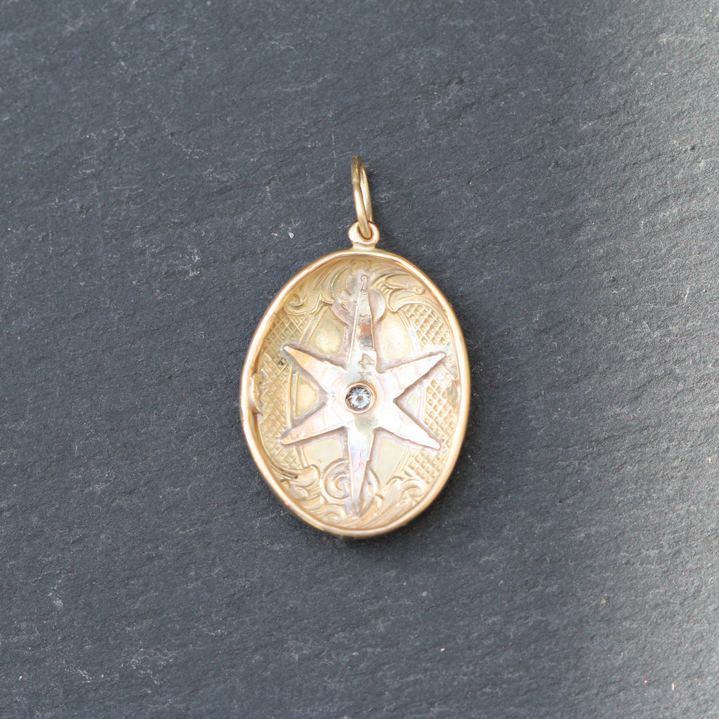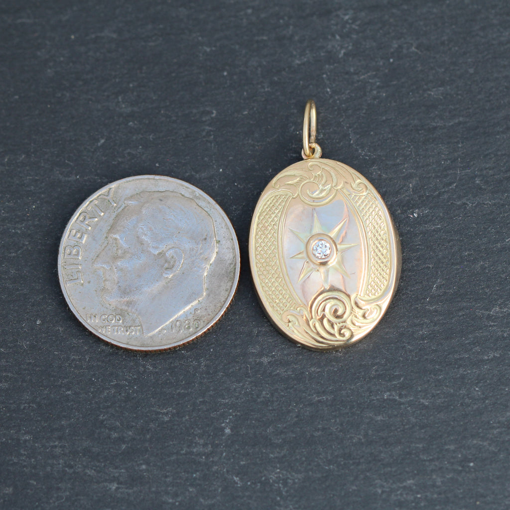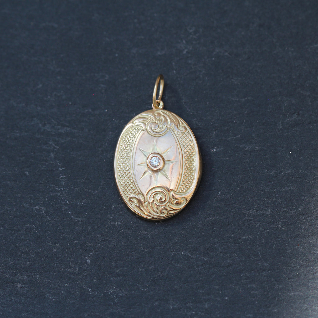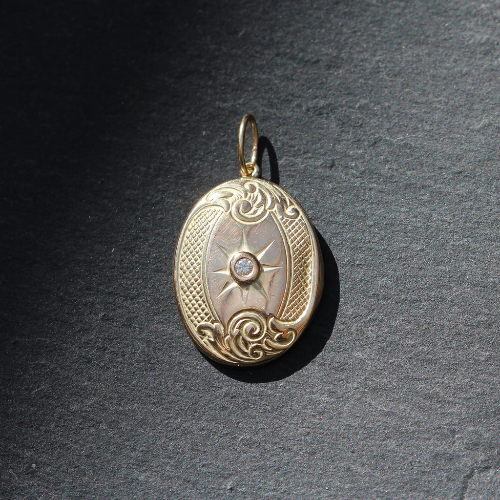 This beautiful 14k yellow gold and diamond oval starburst pendant features diamond cut details throughout with a round cut bezel set diamond in the center. It has been upcycled from an antique cufflink by adding a 14k yellow gold recycled bail creating a one of a kind, ethical gem!