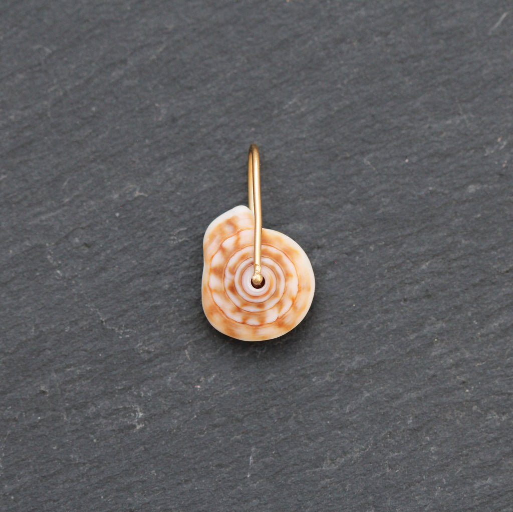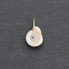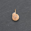This adorable shell charm features a donut style shaped with a swirl and open center. Detailed with a round cut bezel set sapphire and a 14k yellow gold bail.