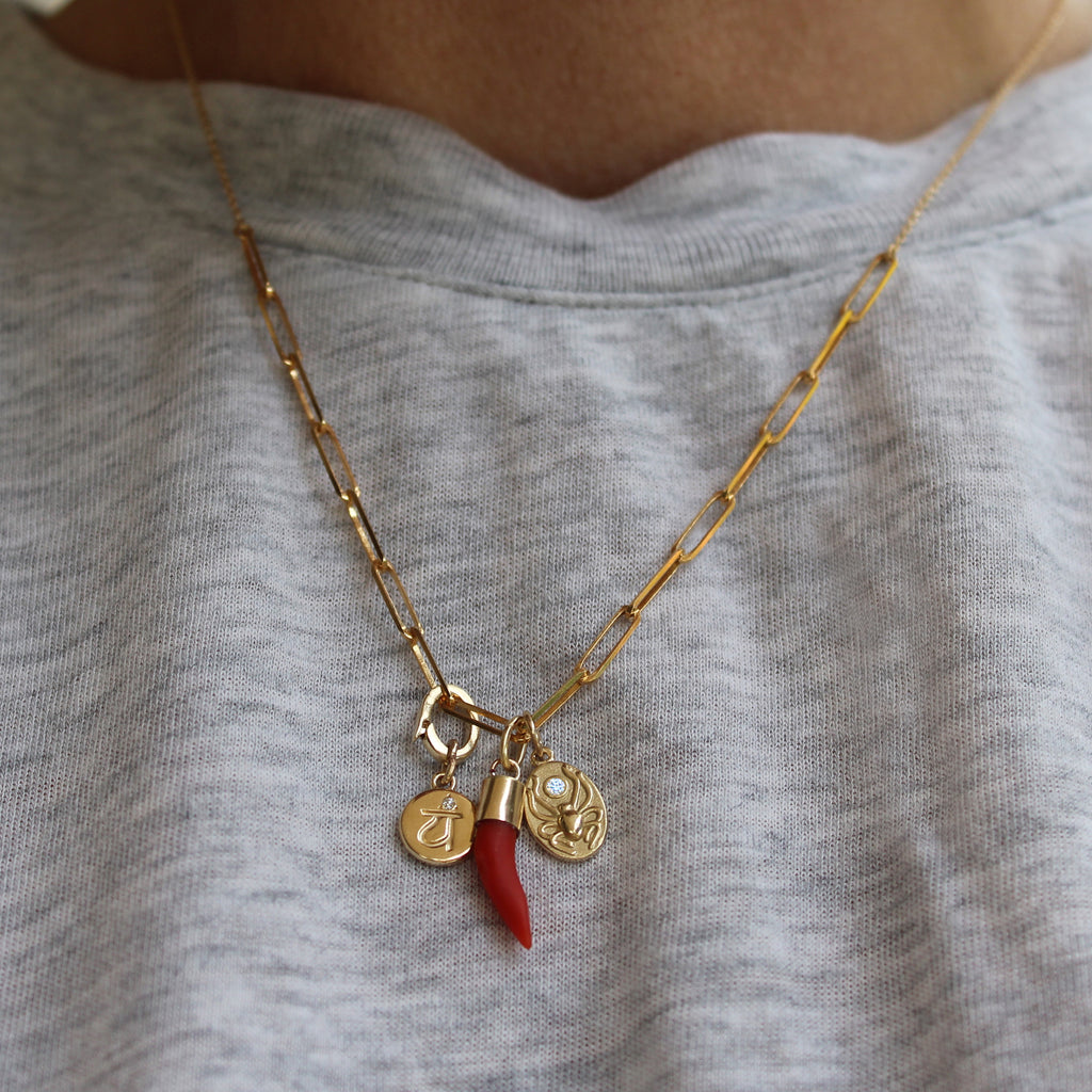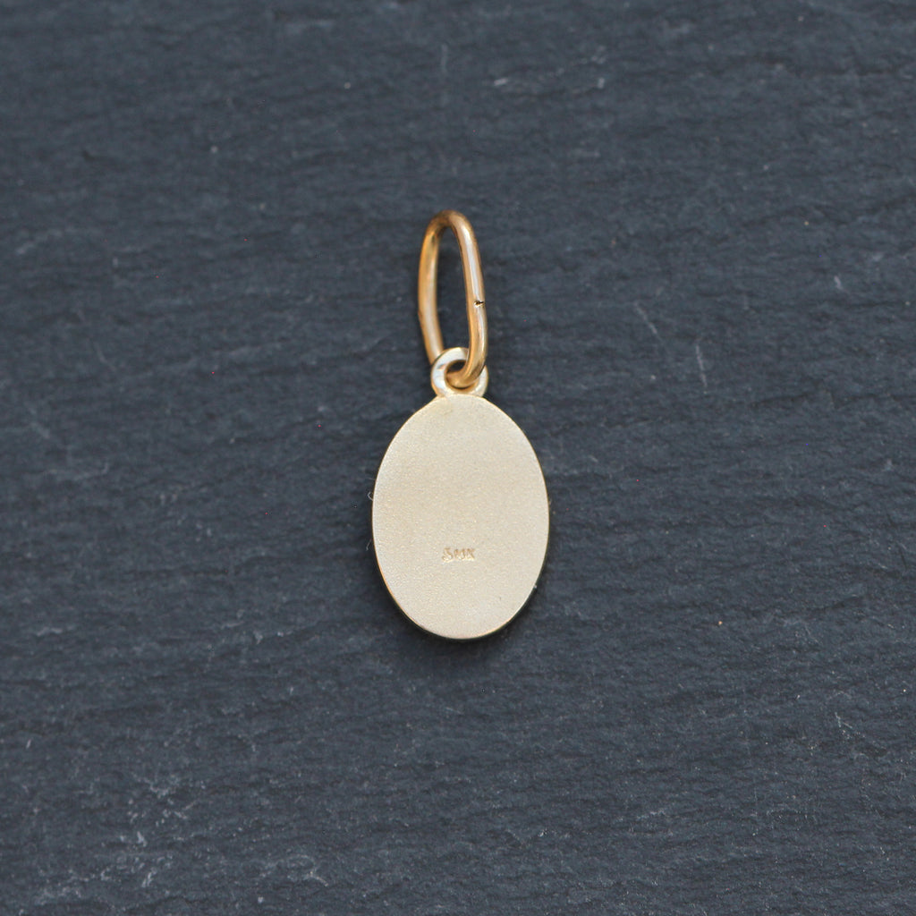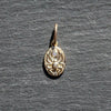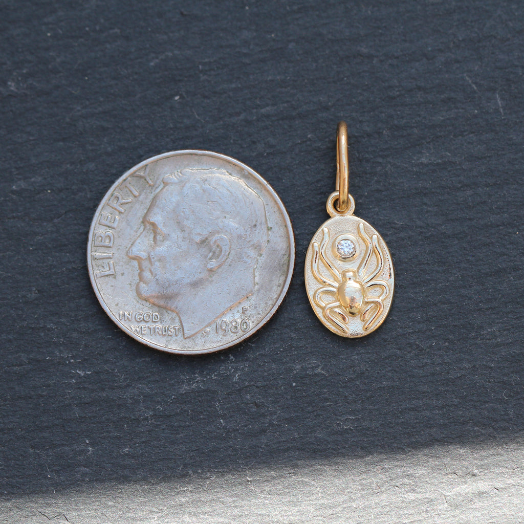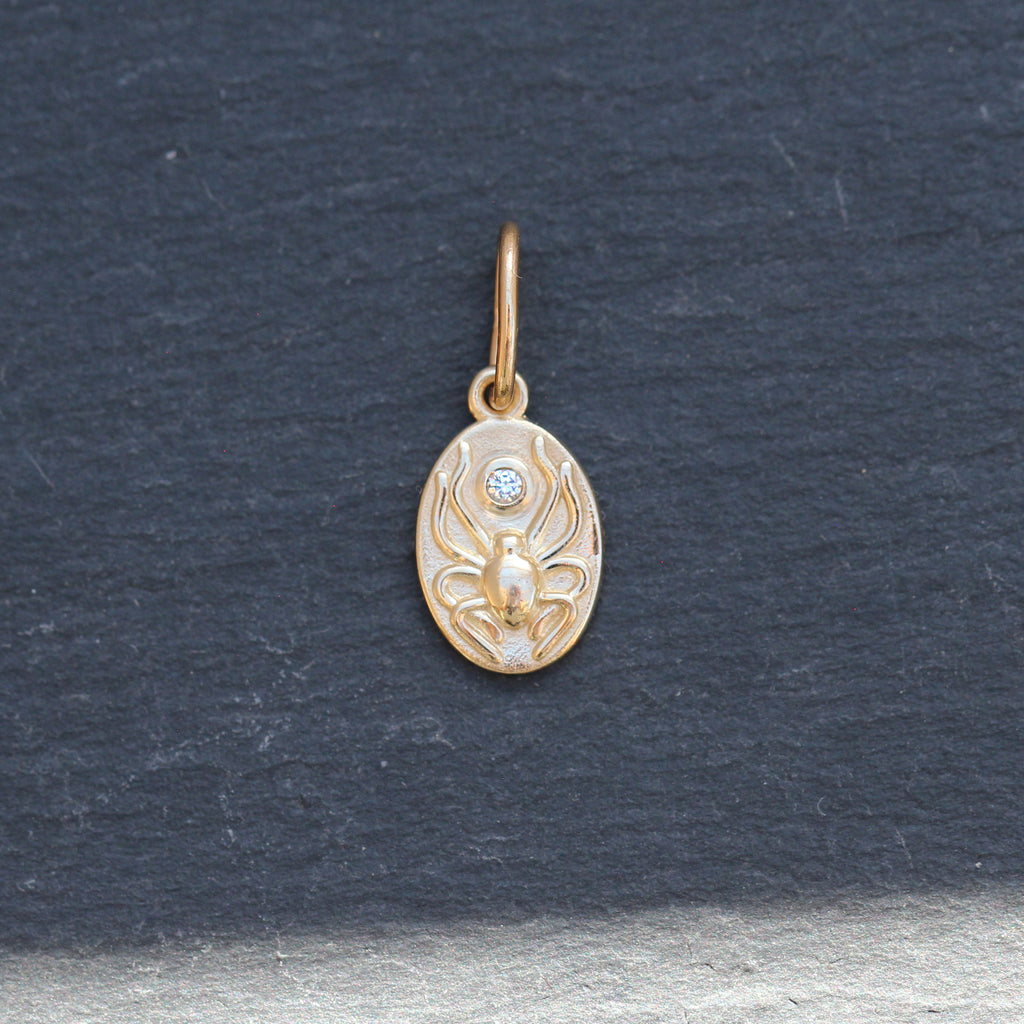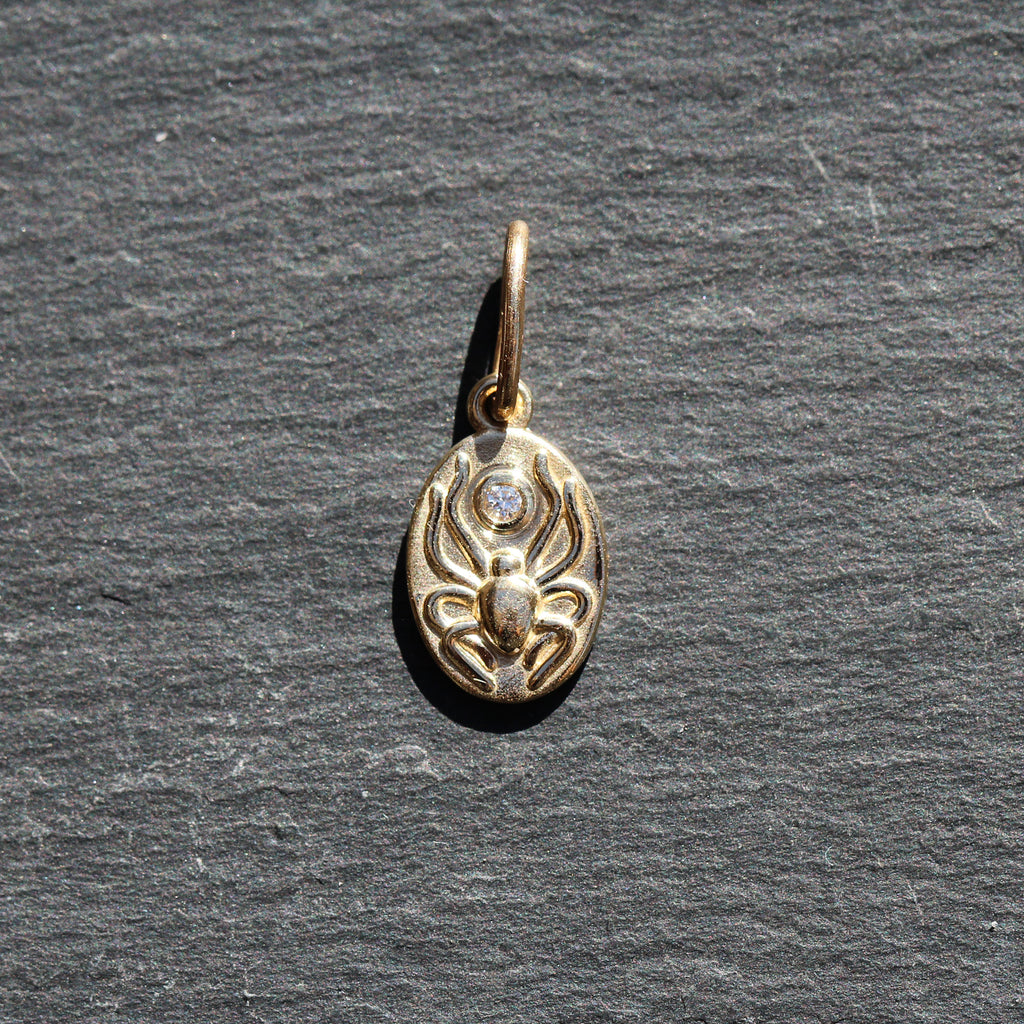 This 14k talisman features a detailed spider with a round cut bezel set diamond above it topped off with a matte backing and high polished details.