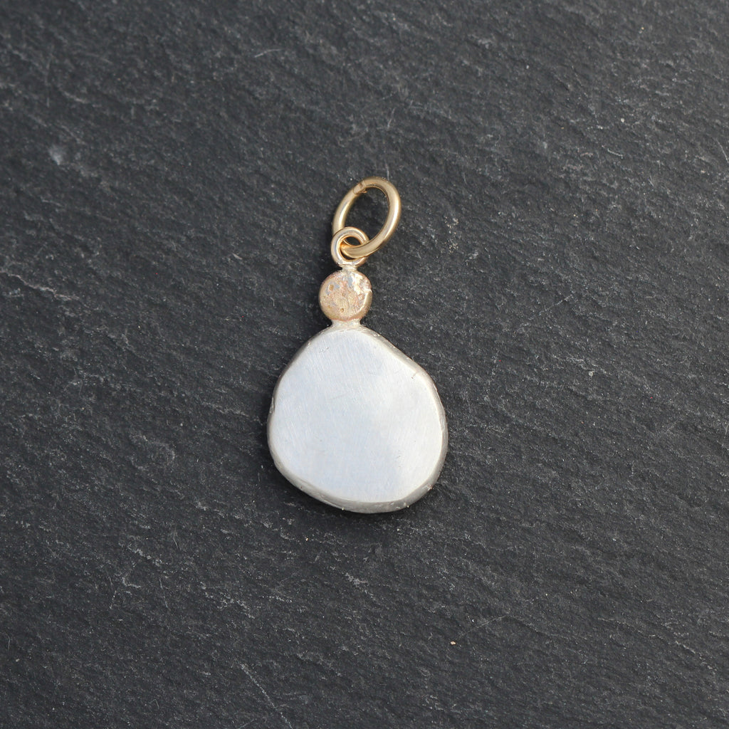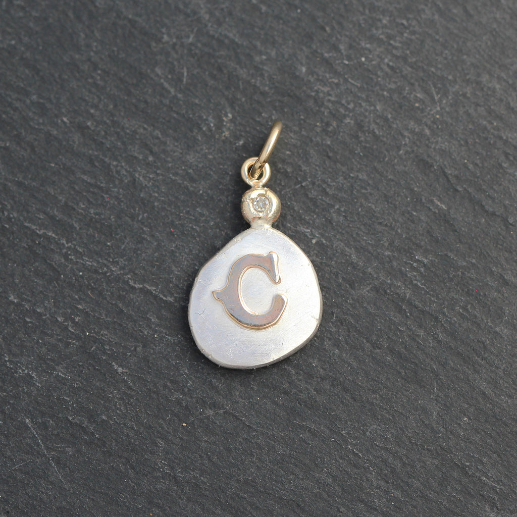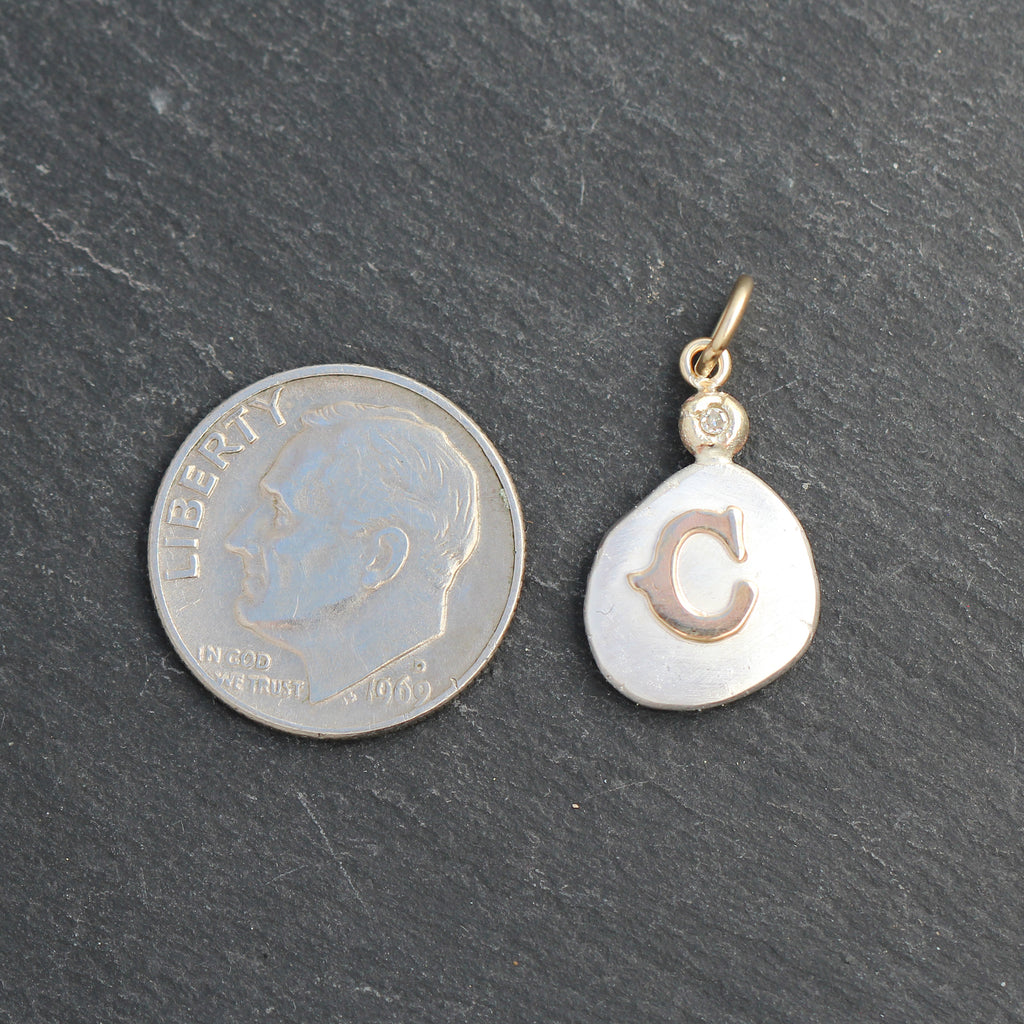 This beautiful mixed metal and diamond pendant has been hand made by us by using entirely recycled materials. Depicting a 14k yellow gold gothic letter C in the center of a recycled melted down and hammered out sterling silver disc giving it a rustic fine jewelry design. It features a 14k yellow gold round cut flush set organic bubble diamond at the top and a 14k yellow gold bail. With the matte silver backing and the high polish letter, it's truly a one of a kind gem for those who love sterling and gold combos!