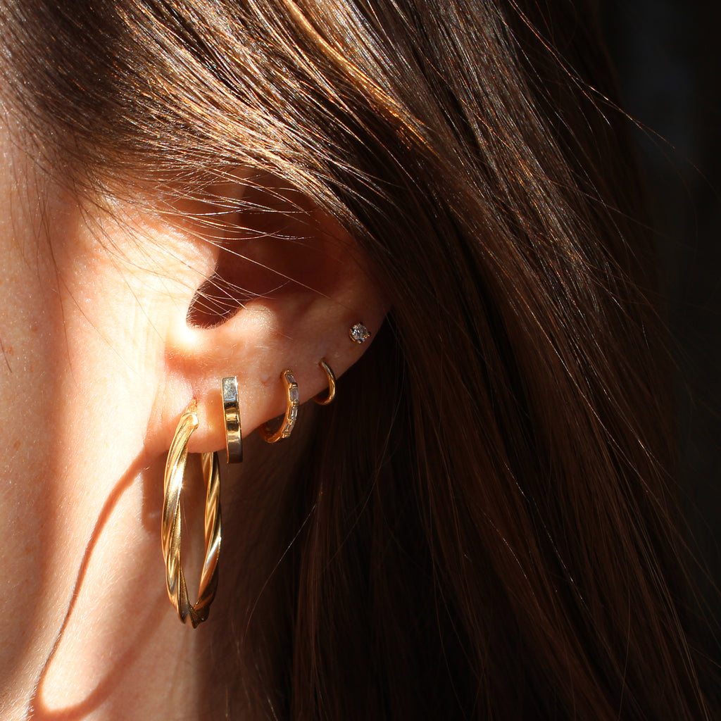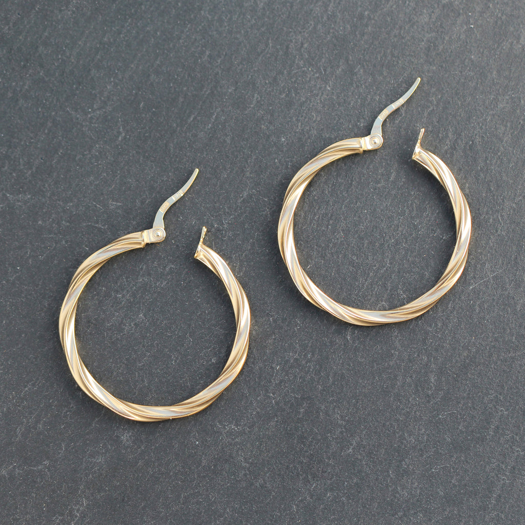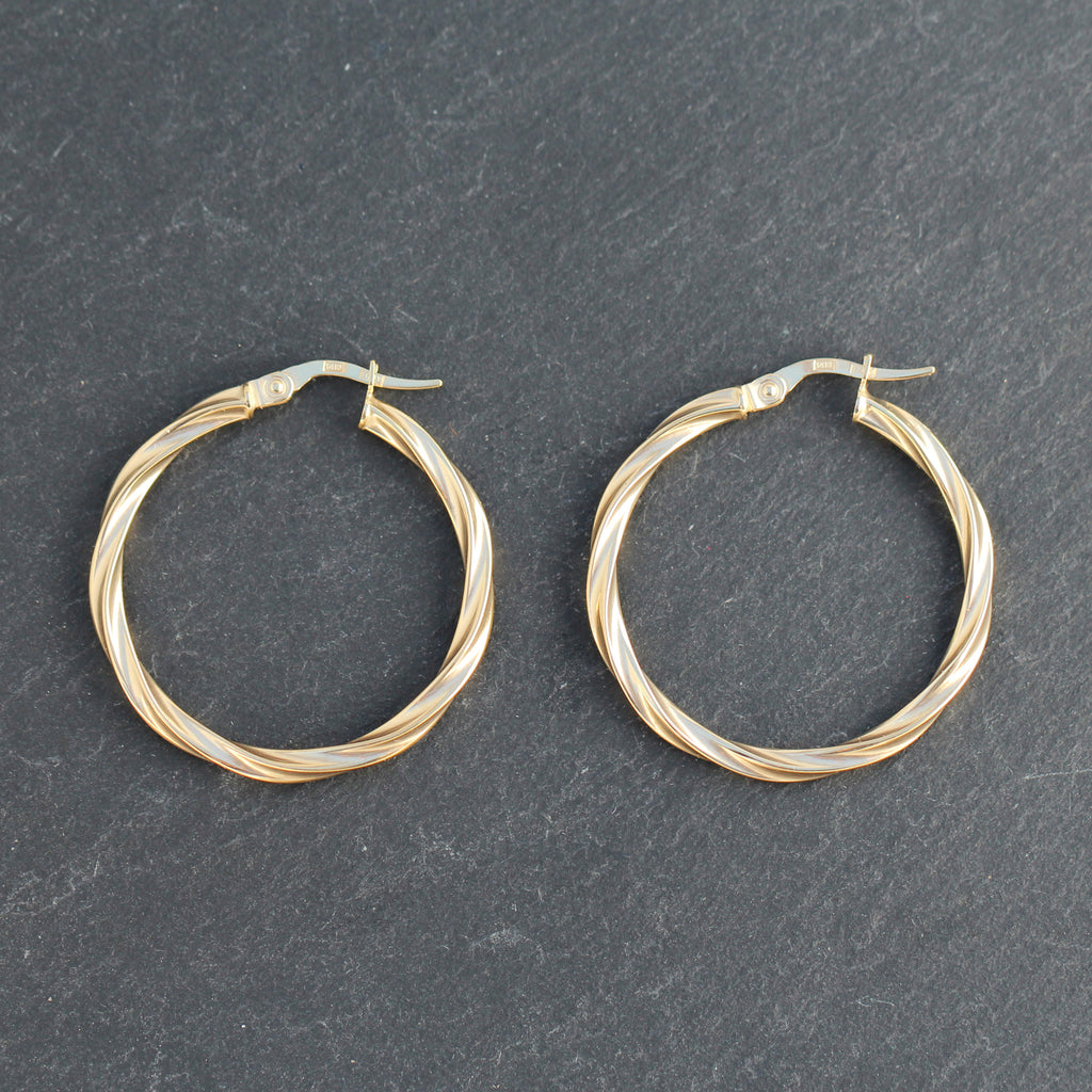 These 14k yellow gold hoop earrings feature a twisted diamond cut detail and are a classic look and the perfect gift for anyone who loves hoop earrings that make a statement!