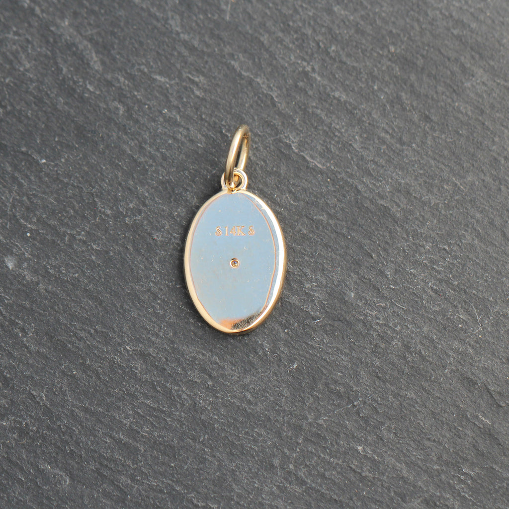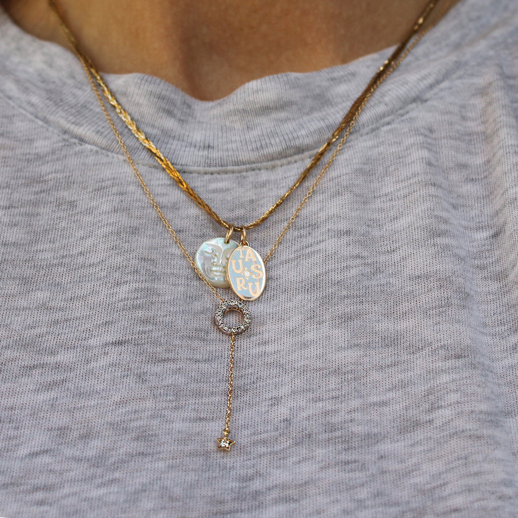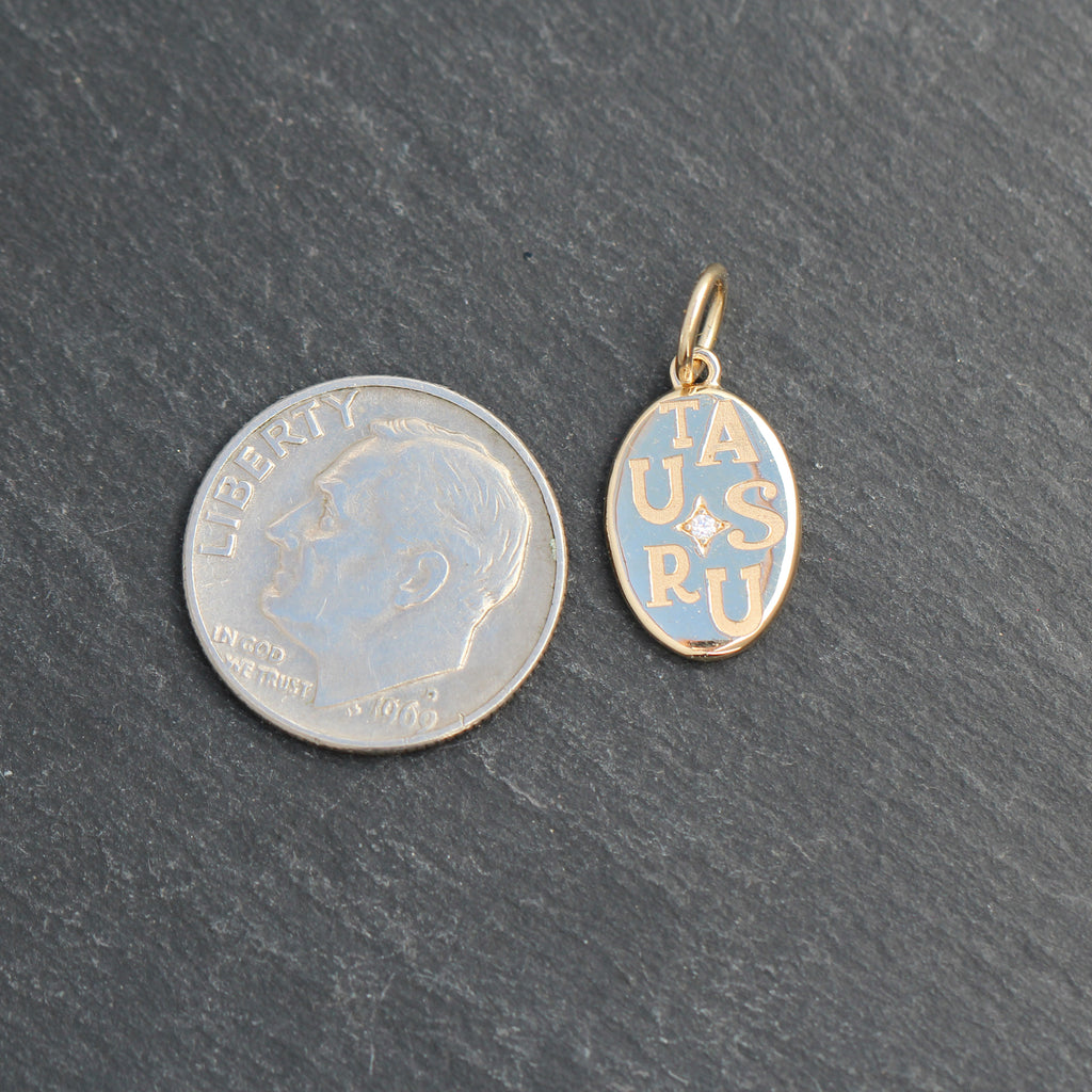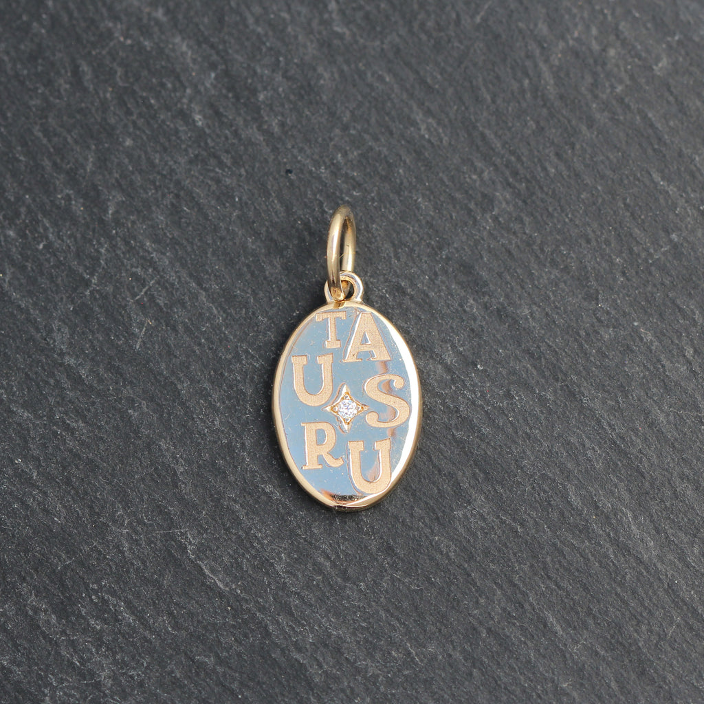 This beautiful 14k yellow gold astrology pendant features the letters for Taurus scattered throughout the edges with a starburst style diamond set in the center. It's a great add to any neckmess and makes a great gift as well!