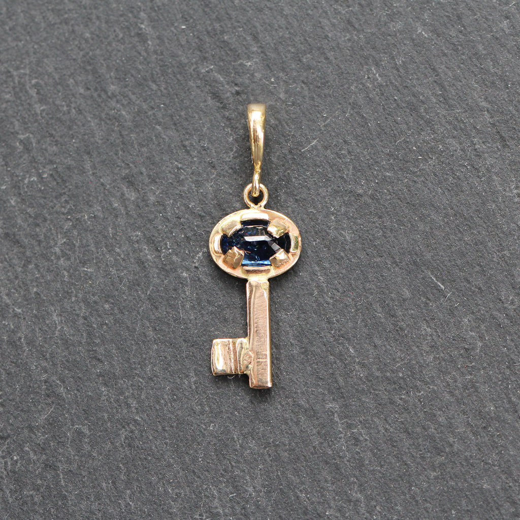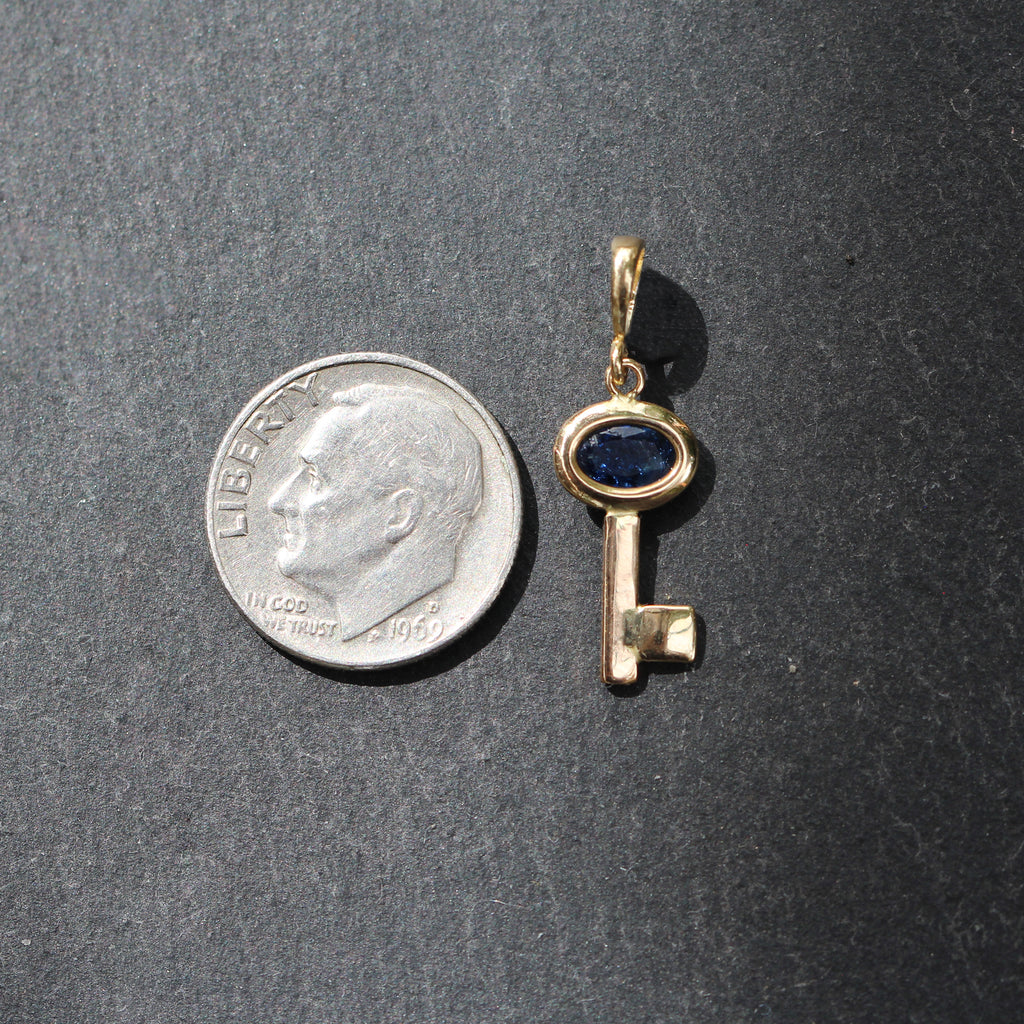 This 14k yellow gold key charm features an oval cut bezel set sapphire with a high polish finish!