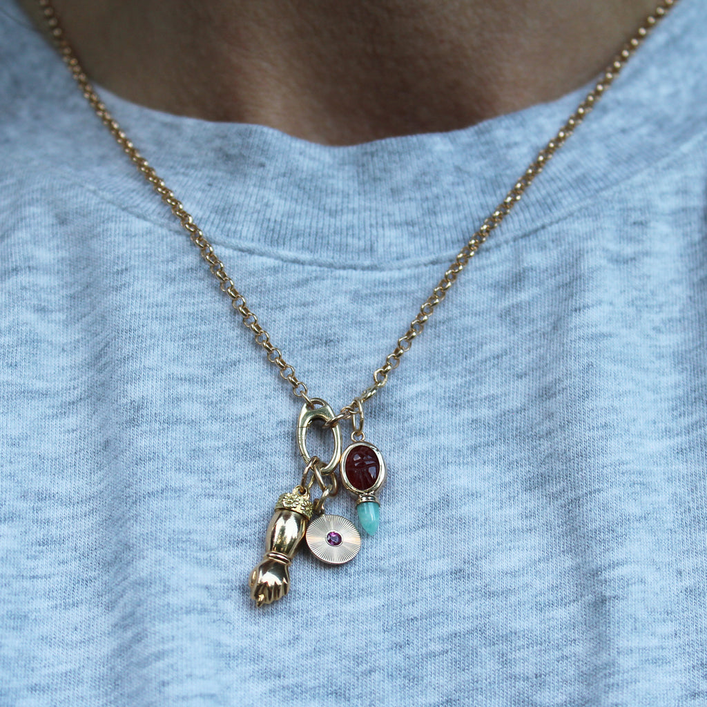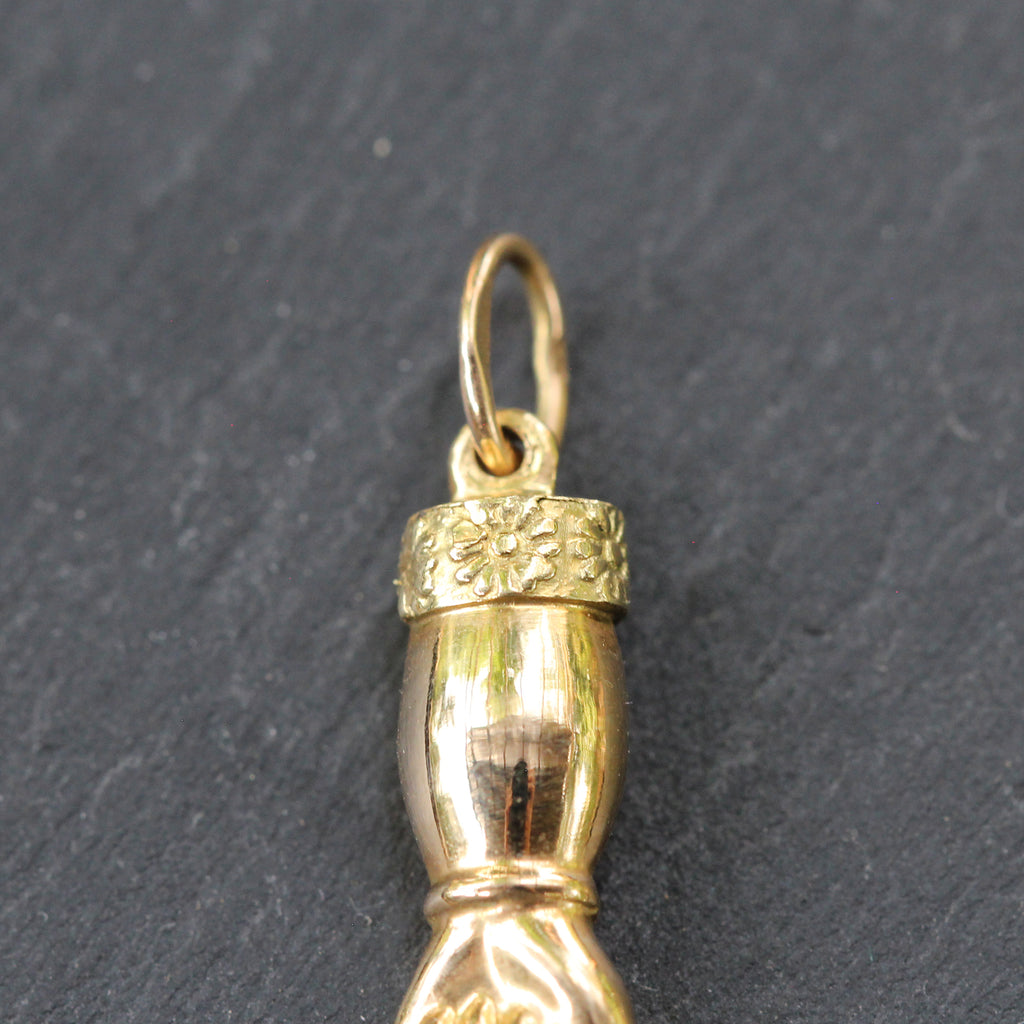 This antique 18k yellow gold Figa talisman features a classic design with a daisy detailed cuff.
