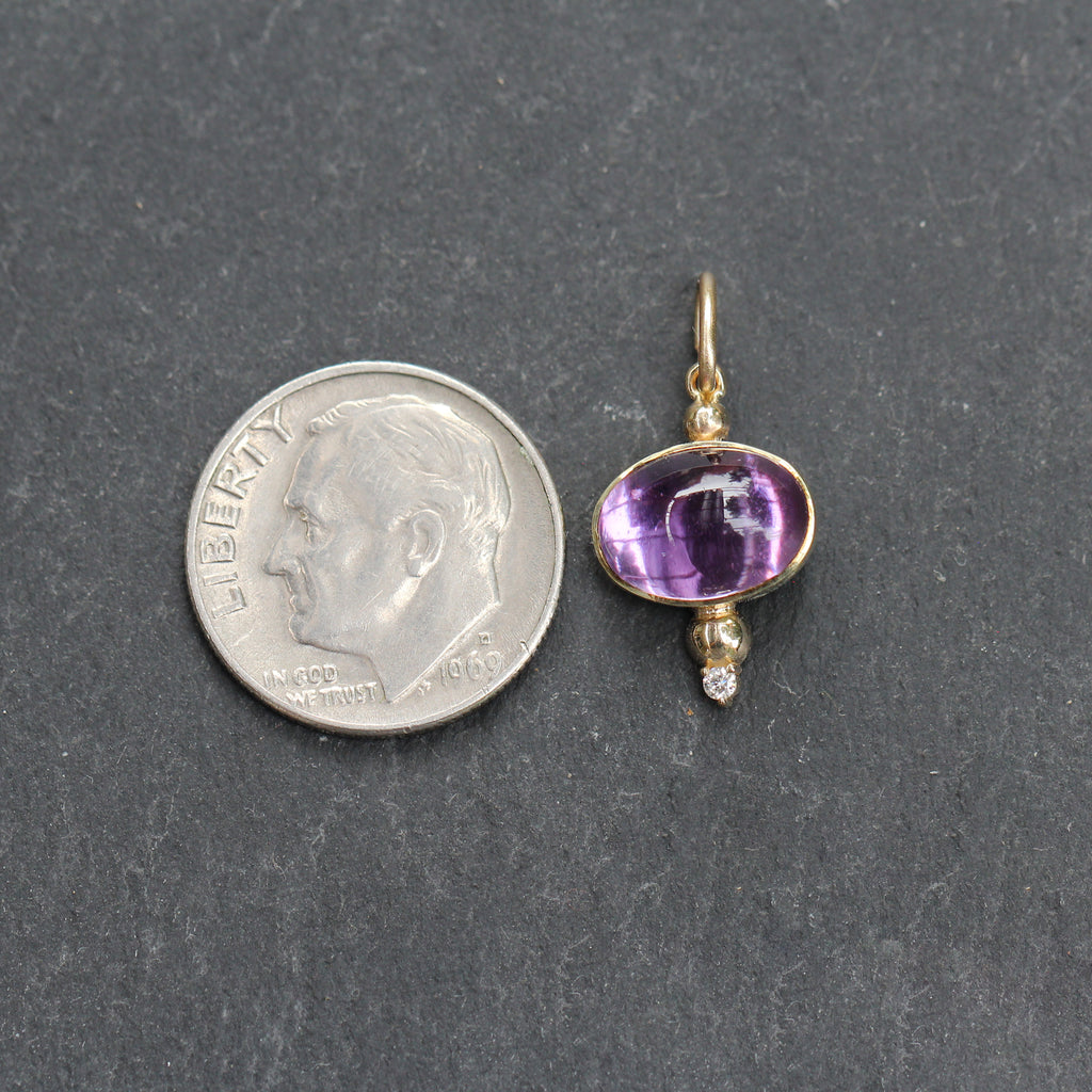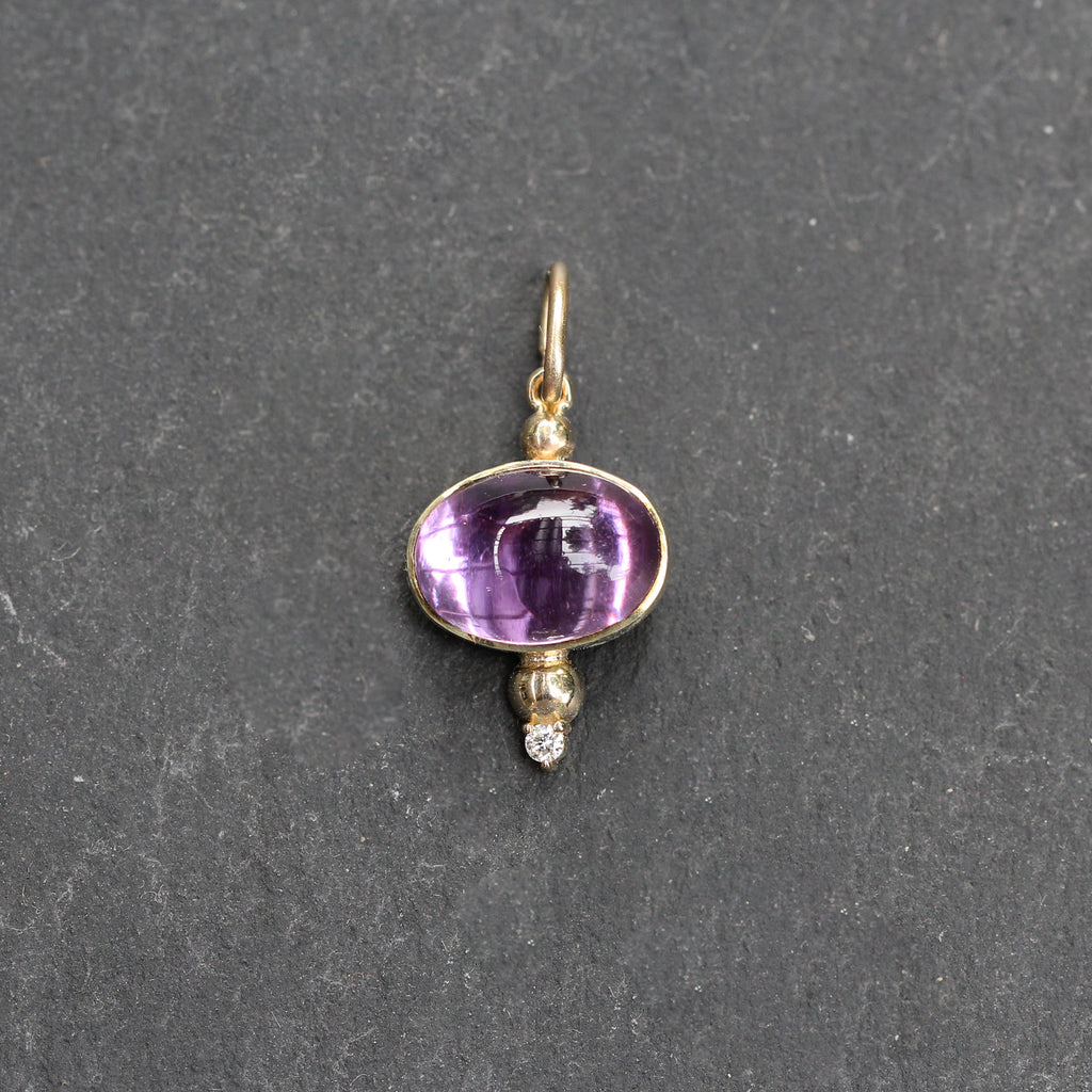 This 14k gold + Amethyst Pendant features a stunning oval cut cabochon amethyst wrapped in a bezel setting. It features a ball detail on the top and bottom with a round cut prong set diamond at the base. It was upcycled from an antique amethyst stick pin creating a beautiful one of a kind piece!