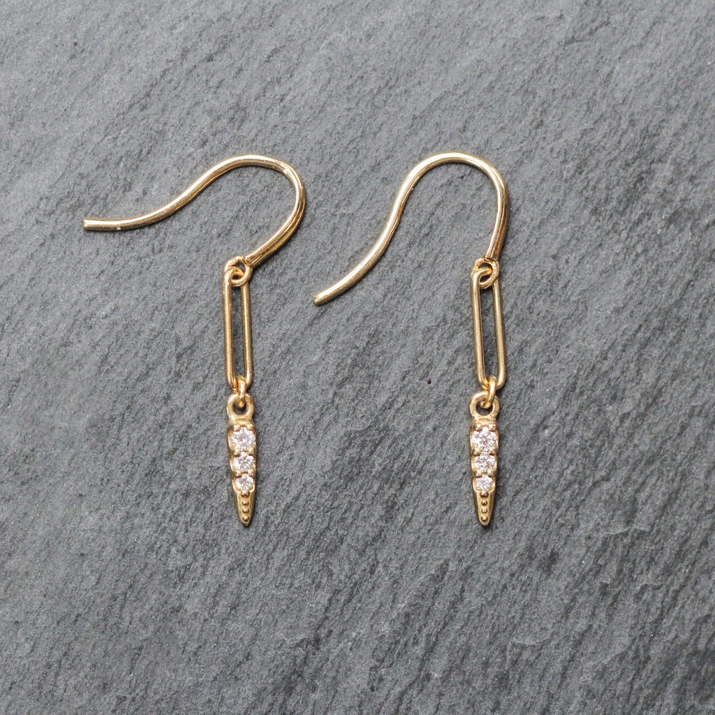 These understated diamond drop earrings are the perfect pair of earrings to wear on a daily basis or for a special occasion. The upcycled earrings were crafted using recycled 14k gold fish hook backs, recycled 14k gold elongated links and finished with round cut prong set diamond spikes at the ends creating one-of-a-kind, ethical diamond earrings.