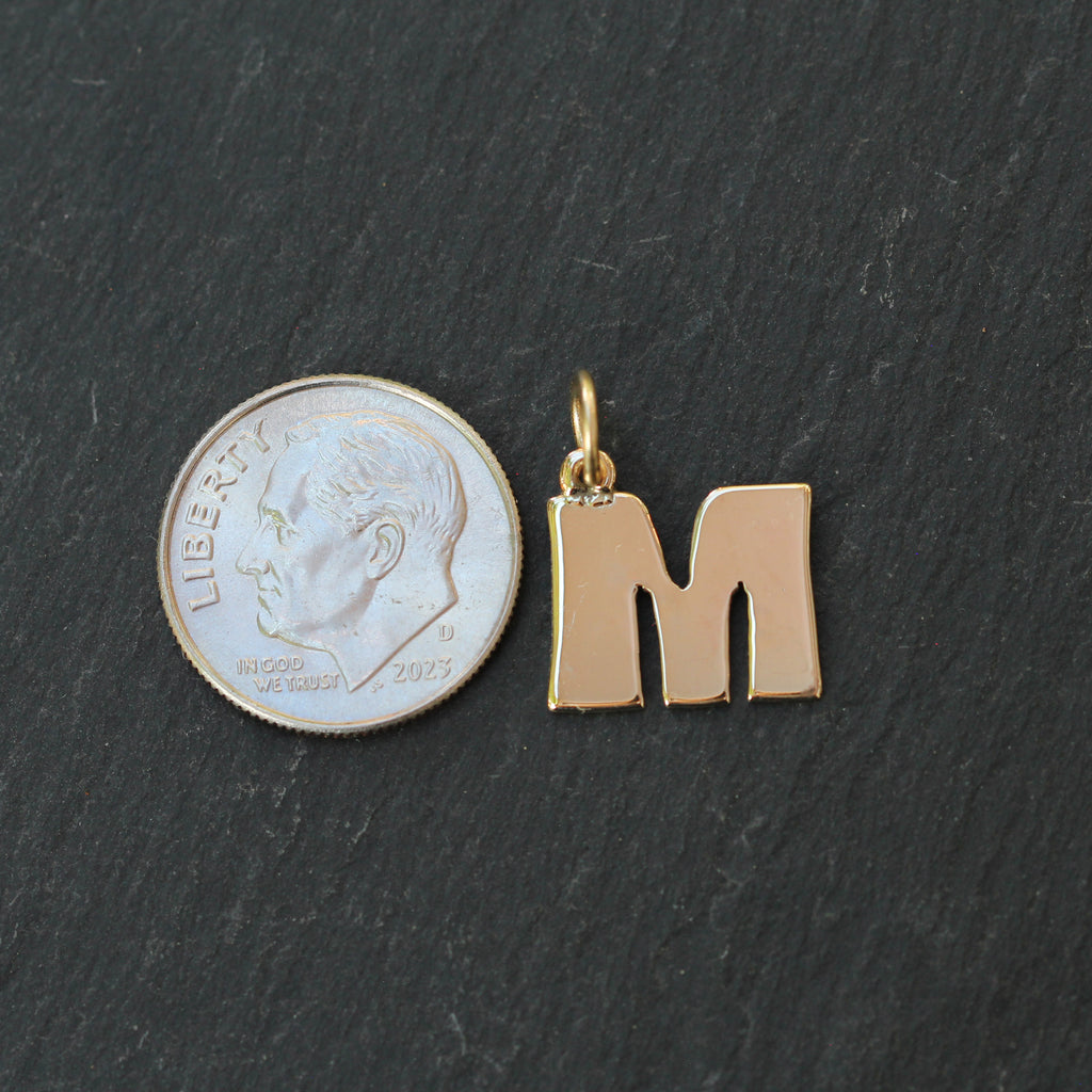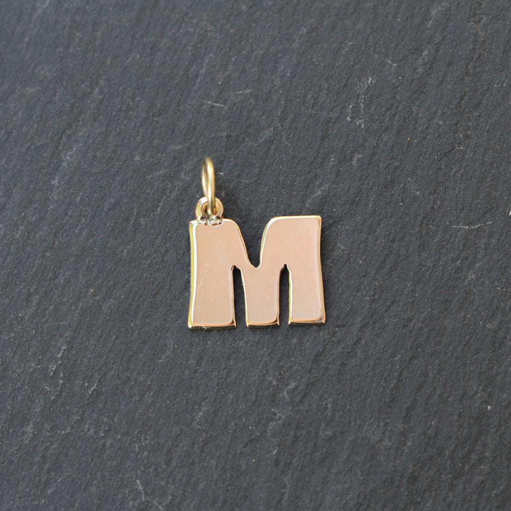 This 14k yellow gold hand cut retro style letter M initial pendant is the perfect simple add to any neckmess and a great gift idea as well!