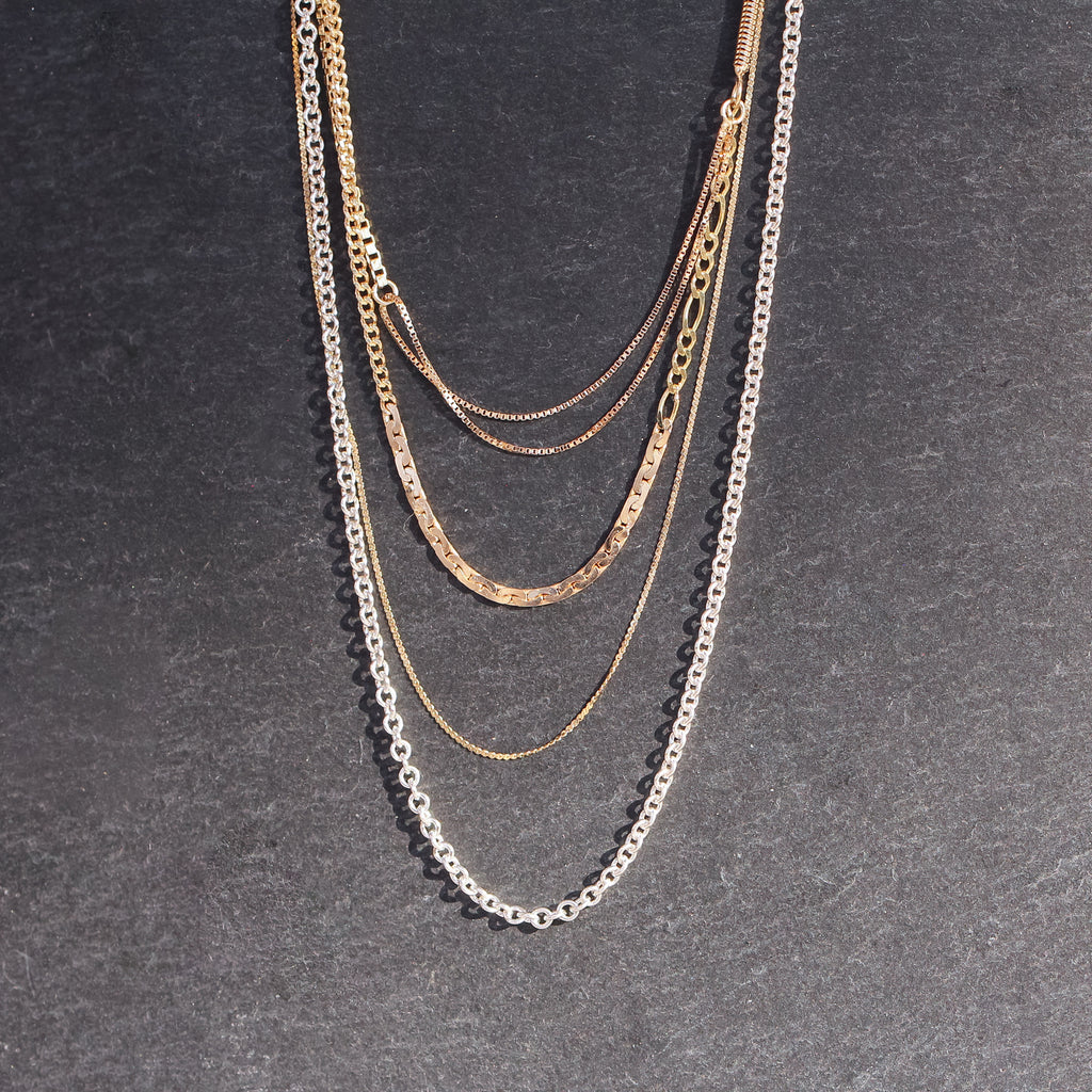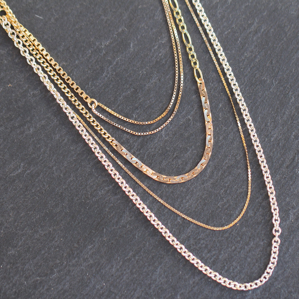 This beautifully unique mixed metal necklace has been upcycled by using multiple different styles of 14k yellow gold chains and one cable link chain. The tiers of chain styles give it a the look of wearing multiple chains. Through recycling all of these chains, we have created a one of a kind, ethically made statement necklace!